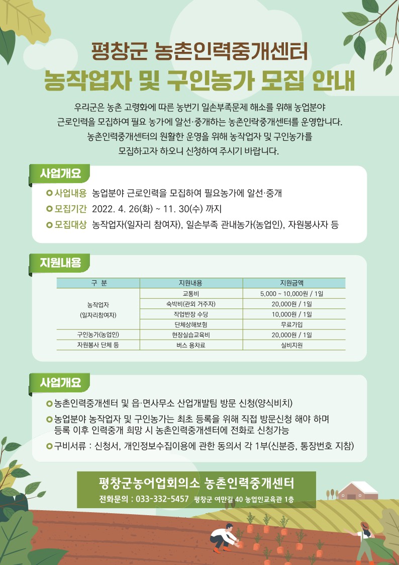 전화문의 : 033)332-5457(평창군농어업회의소 농촌인력중개센터)