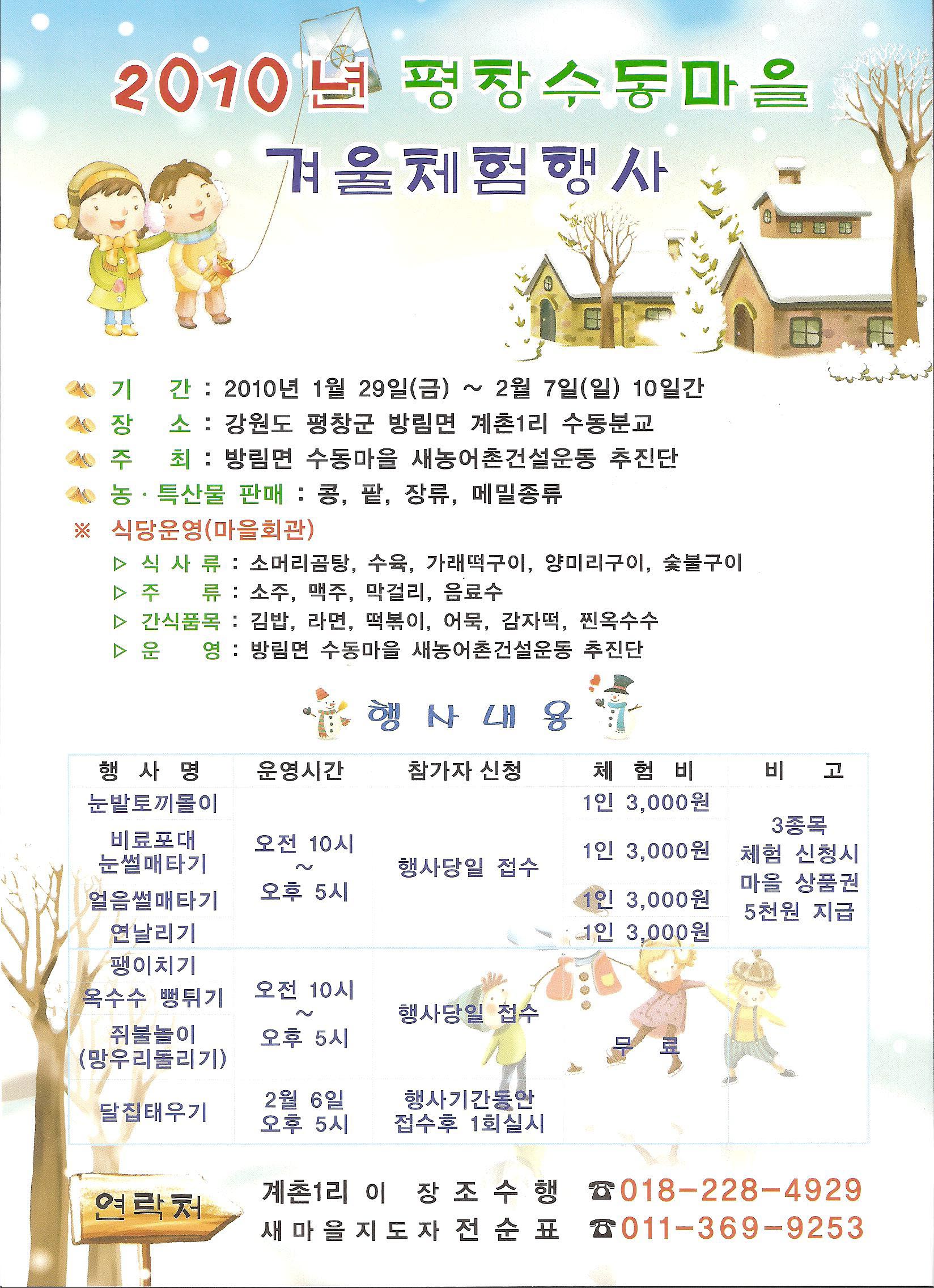 평창군 방림면 계촌1리 수동마을에서 겨울체험행사를 하오니 많은 참석 부탁드려요~~ *^^*