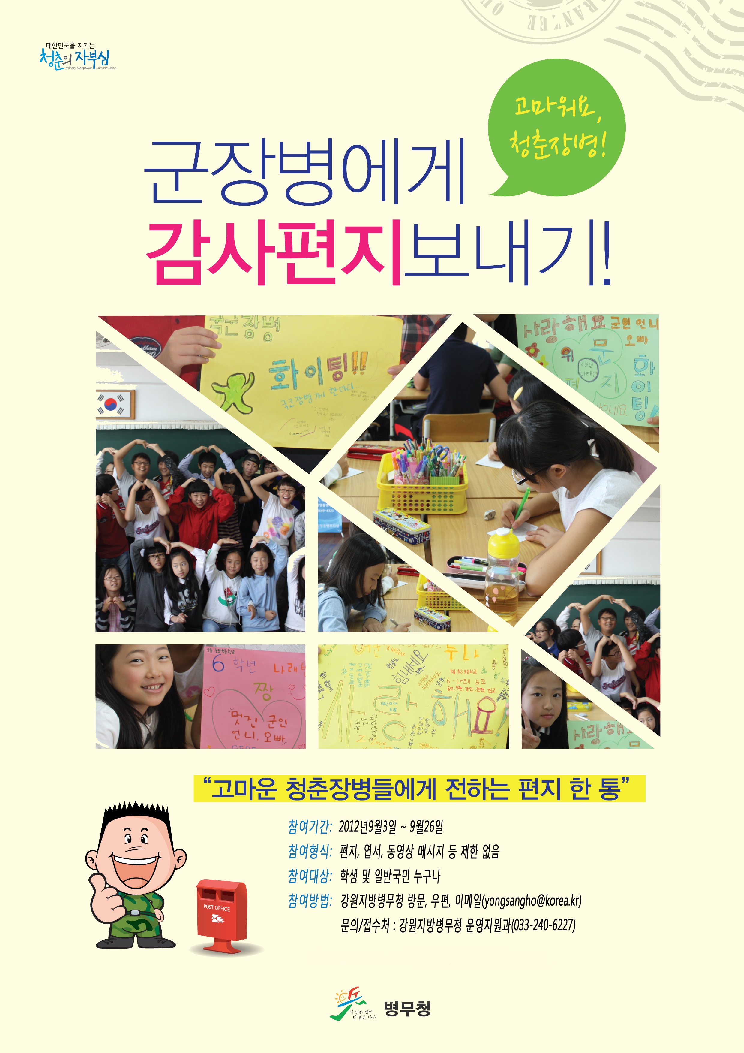강원지방병무청에서는 병역을 당당하게 이행하고 있는 군 장병들에게 국민들이 직접 감사의 마음을 전하는 "고마워요, 청춘장병! 군 장병에게 감사편지 보내기 캠페인"을 전개하고 있습니다.