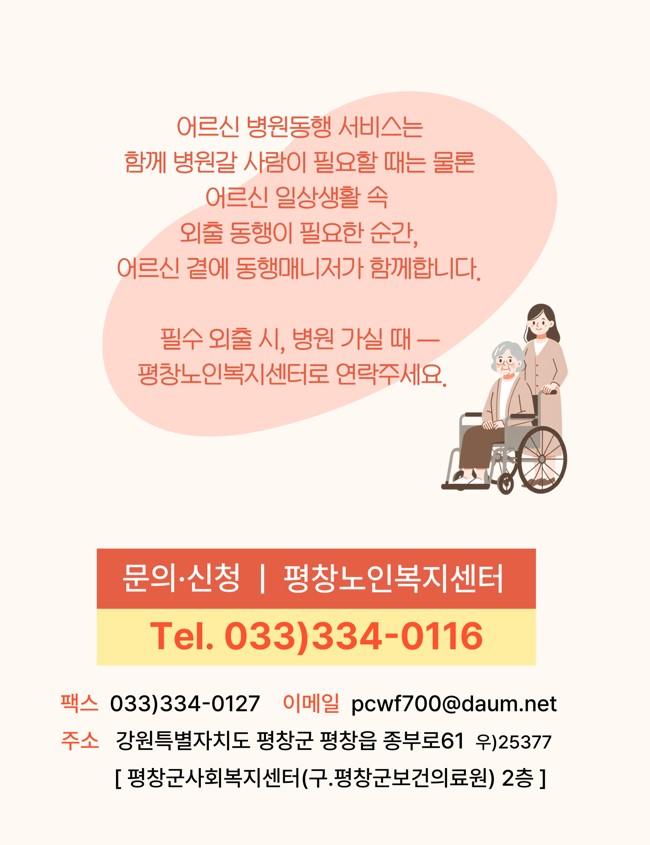 어르신 병원동행 서비스 수행기관 [평창노인복지센터]로 연락주세요.