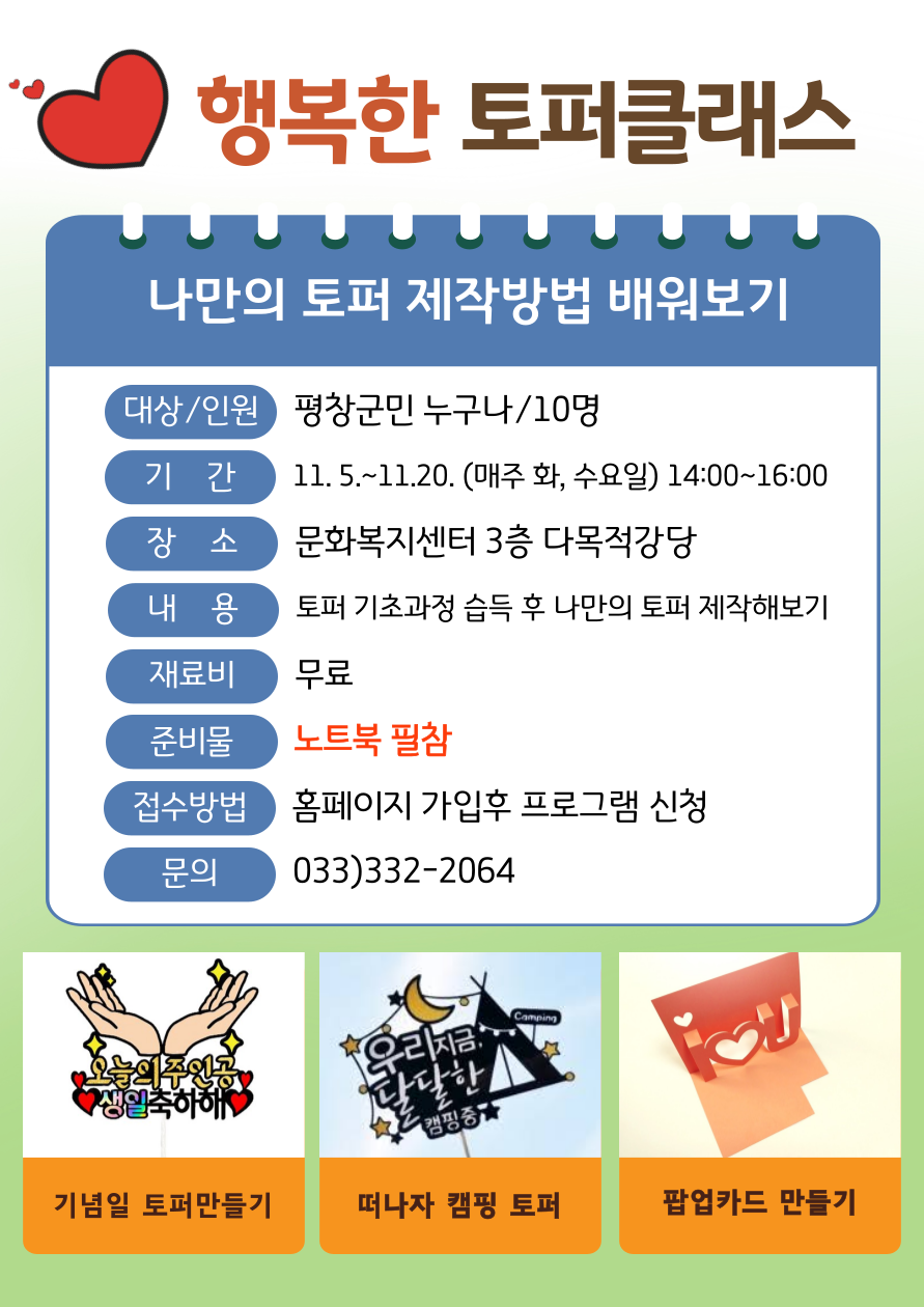접수방법: 홈페이지 가입후 프로그램 신청(https://pyeongchang.familynet.or.kr/center/index.do)