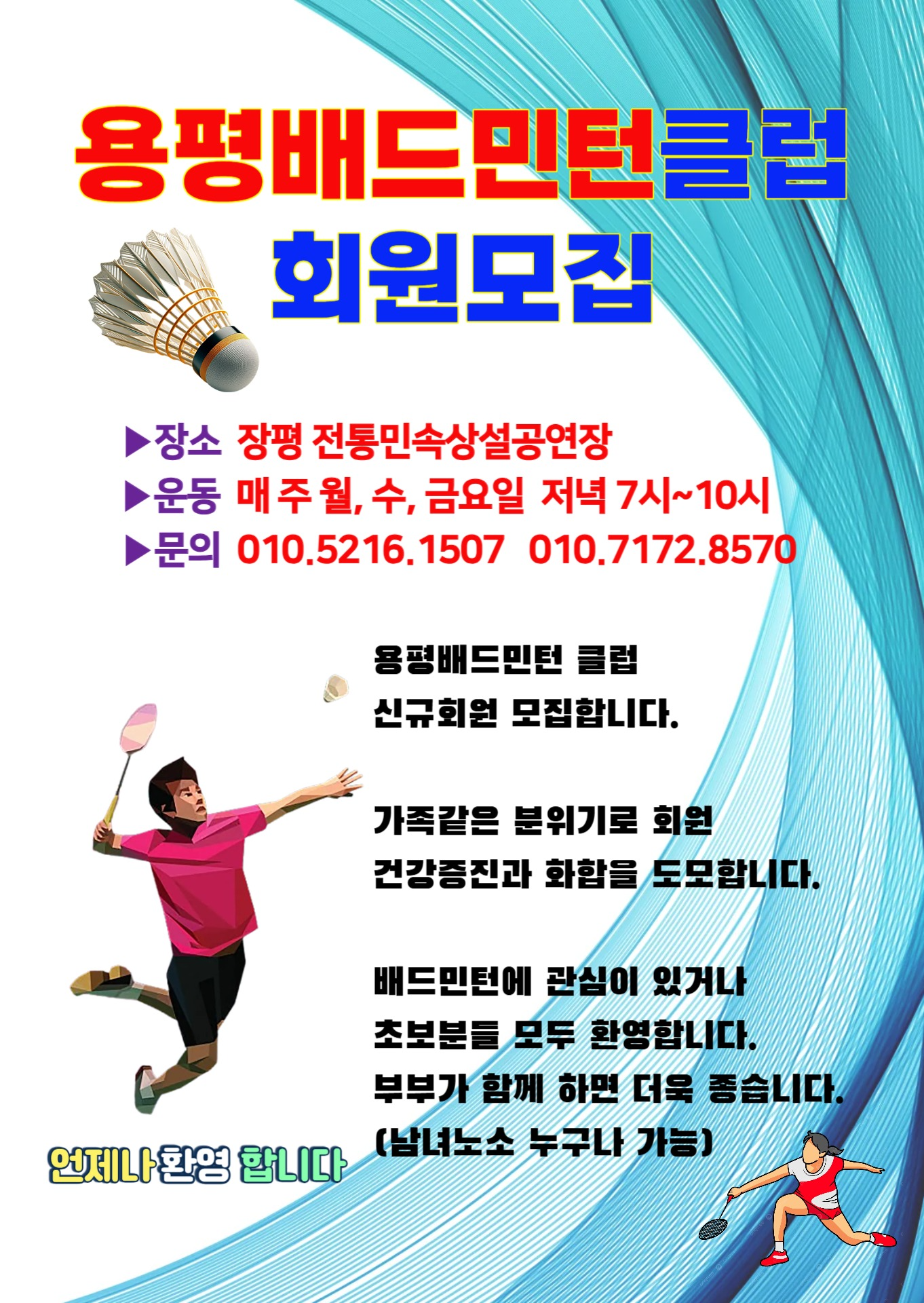 안녕하세요. 용평배드민턴클럽에서 신규회원을 모집합니다. 남녀노소 상관없이 배드민턴에 관심이 있으신 분들 모두 환영합니다. 편하게 오셔서 체험해 보시고 가입 결정하셔도 되니 언제든 문의 주시고 찾아와 주세요.