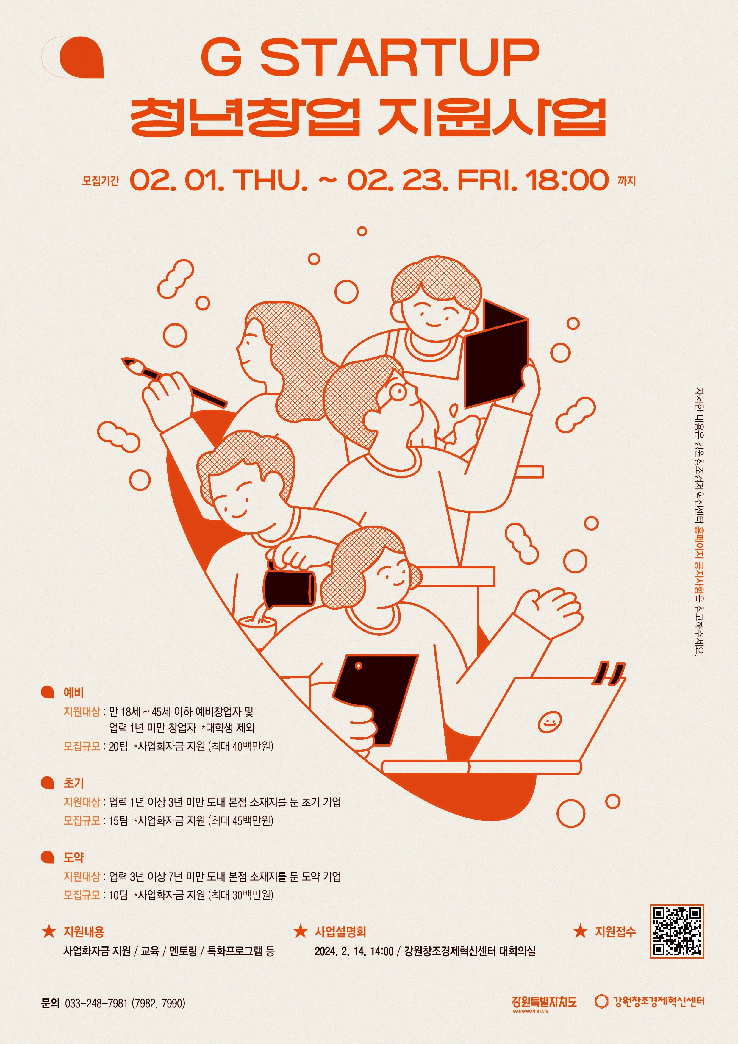강원창조경제혁신센터에서는 강원특별자치도와 함께 혁신적인 기술 창업 소재가 있는 창업기업을 육성하기 위한 G-스타트업 예비창업/초기창업/창업도약 지원사업을 운영하고 있습니다. 이와 관련하여 도내에 유망한 (예비)창업자분들의 많은 참여 부탁드립니다.