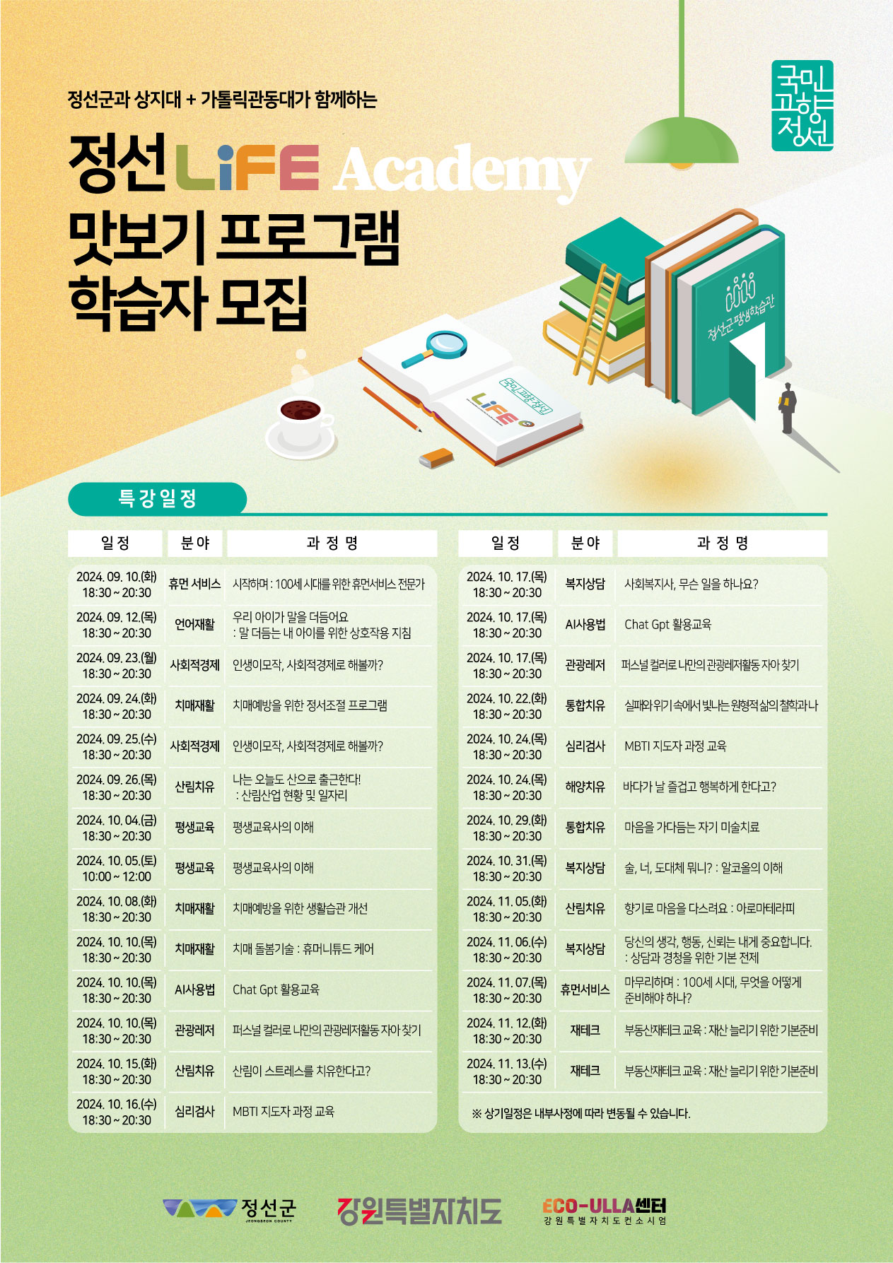 정선군평생학습관에서는 2025년 지역 내 대학의 로컬캠퍼스(학사학위과정) 개설을 위한 맛보기 강좌를 운영하고자 합니다. 2개 대학의 13개 과정을 진행하오니 평창군민 여러분들께서도 많은 관심 가져주시기를 부탁드립니다.