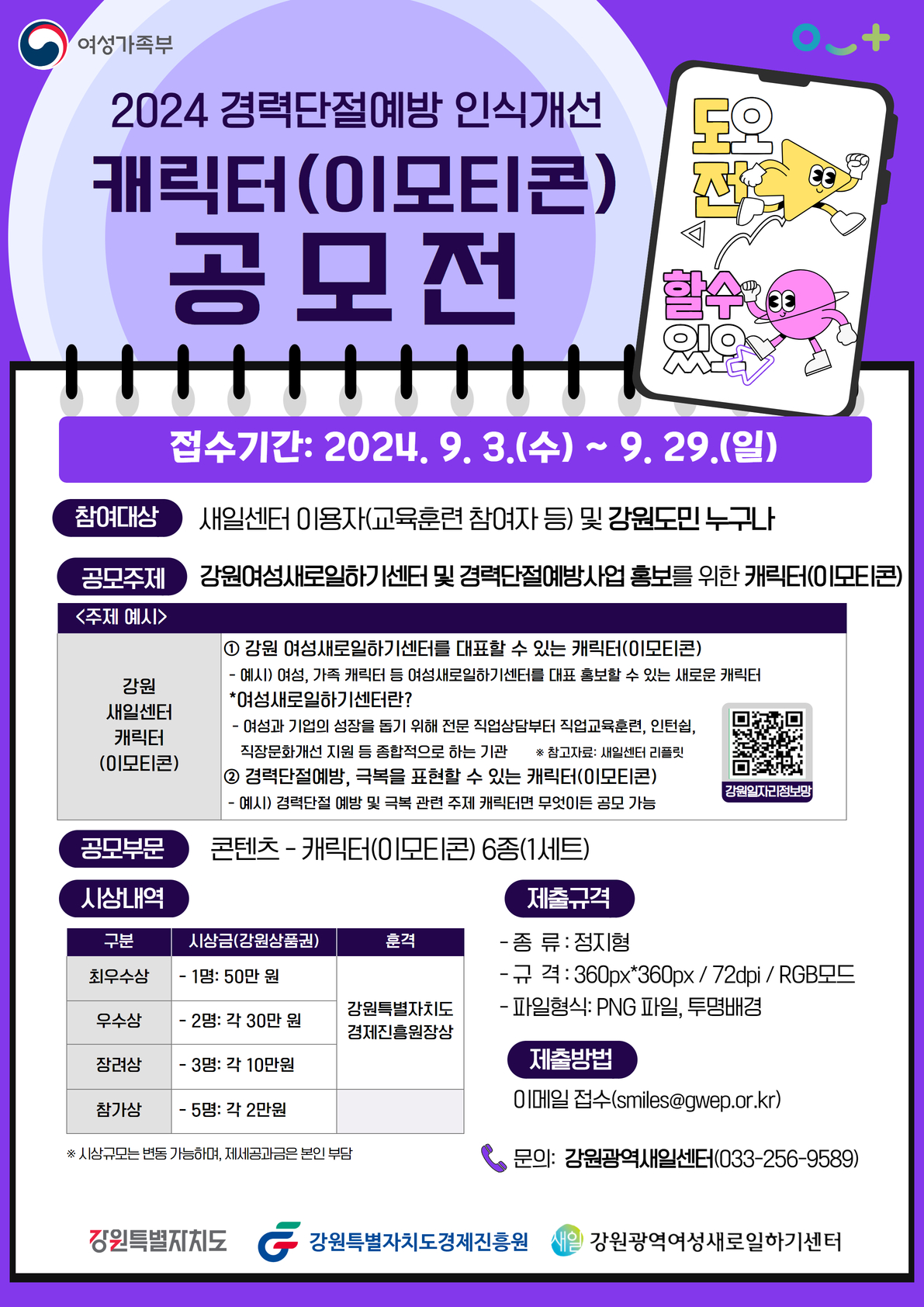 ❍ 공 모 명: 2024년 경력단절예방 및 강원여성새로일하기센터 캐릭터(이모티콘)공모전