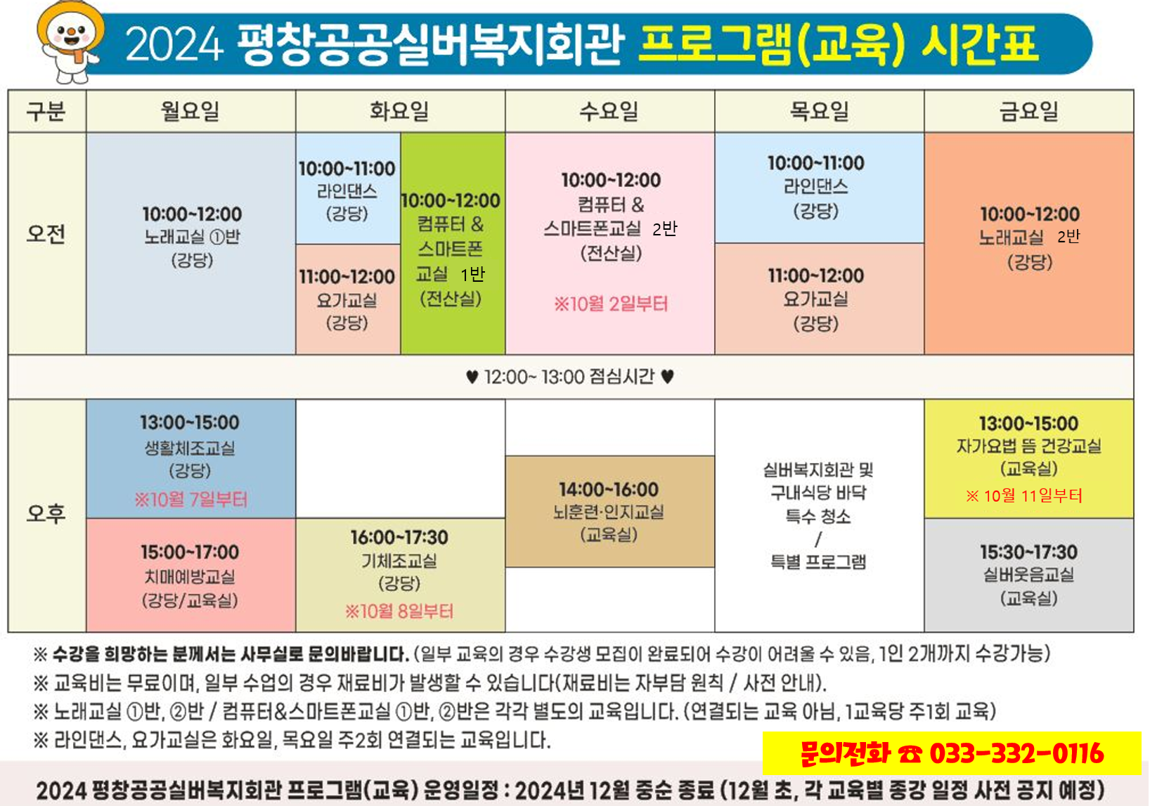 ※ 치매예방교실, 노래교실 등 일부 교육에 한하여 신청 가능하오니, 수강을 희망하는 강좌나 교육이 있을 경우 평창공공실버복지회관으로 연락주시기 바랍니다.