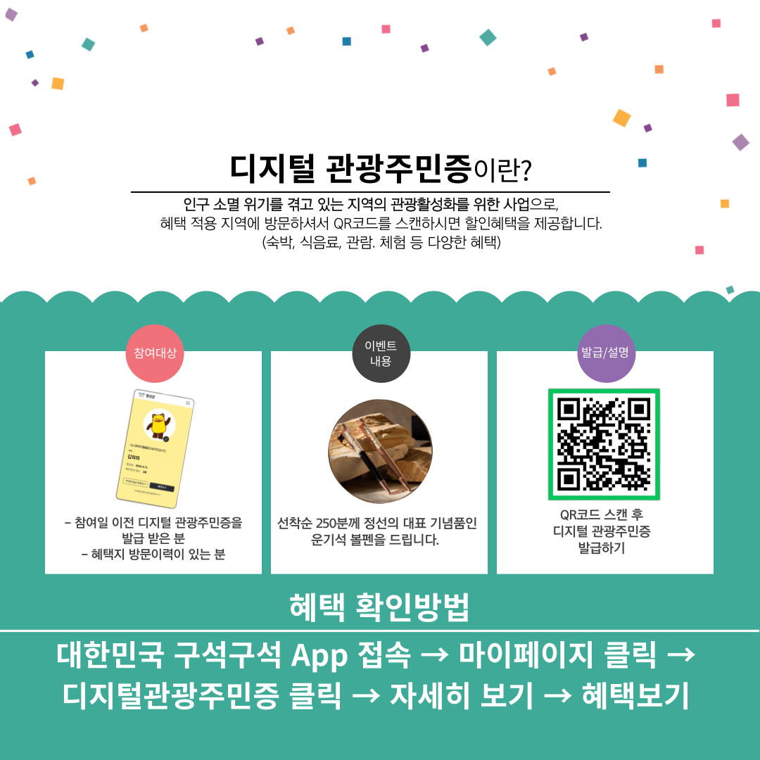 - 디지털관광주민증이란 인구 소멸 위기를 겪고 있는 지역의 관광활성화를 위한 사업으로, 혜택 적용 지역에 방문하셔서 QR 코드를 스캔하시면 할인혜택을 제공합니다! (숙박, 식음료, 관람, 체험 등 다양한 혜택)