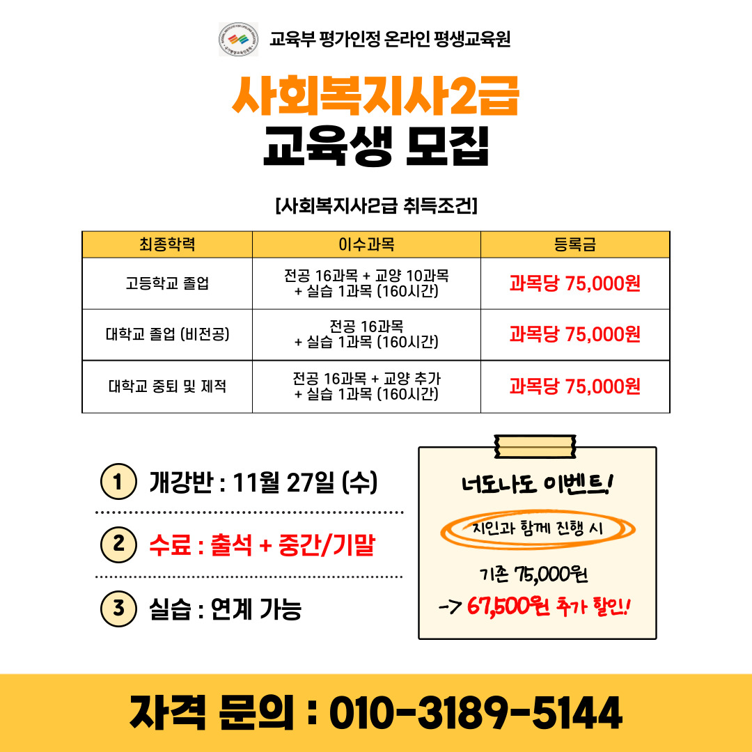 ㉠ 온라인 과목 : 75,000원 (기존 50%할인 + 지인 동반 시 5% 추가 할인)