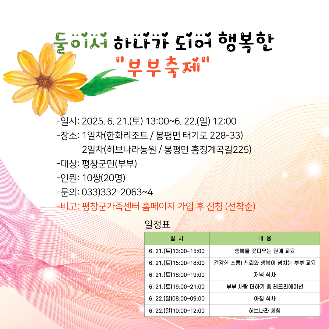 평창군가족센터 둘이서 하나가 되어 행복한 "부부 축제" 프로그램 안내