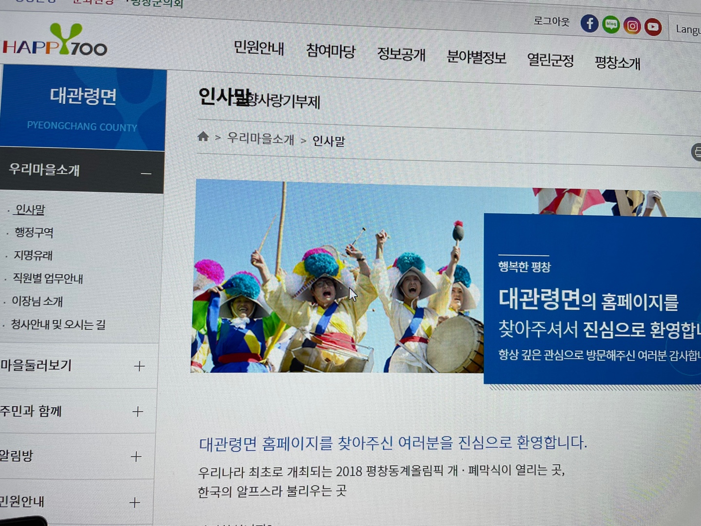 대관령면 _우리마을소개_인사말 사진은 용평면 평창둔전평농악 사진입니다. 대관령면의 강원도무형문화재 황병산사냥놀이 사진으로 교체하는 것을 제안합니다.