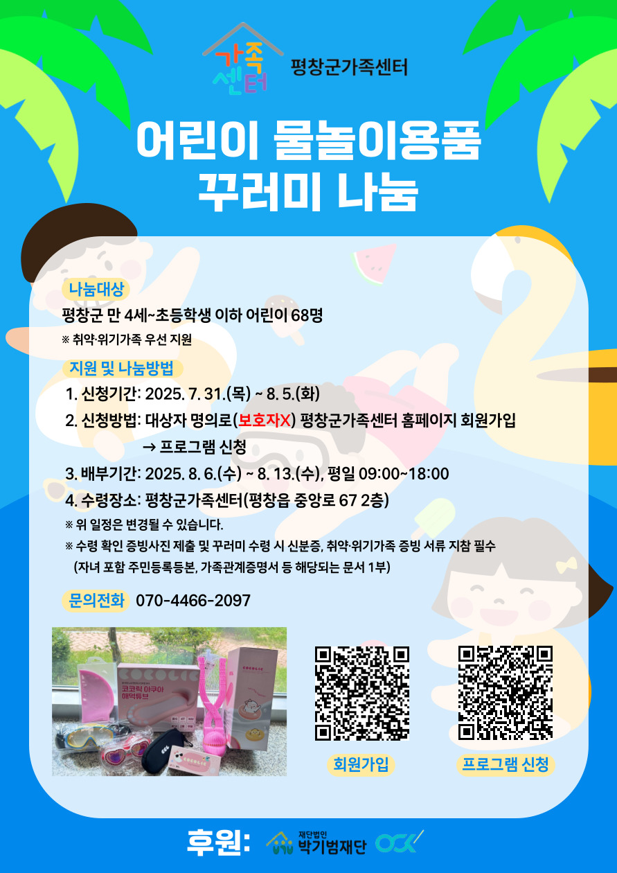 [평창군가족센터] “어린이 물놀이용품 꾸러미” 나눔 대상자 모집합니다.