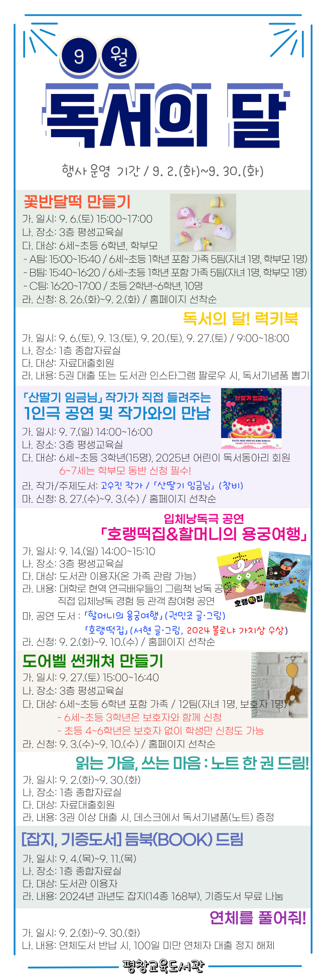 [평창교육도서관] 9월 독서의 달 행사 안내(공연, 체험 등 9개 행사 운영)