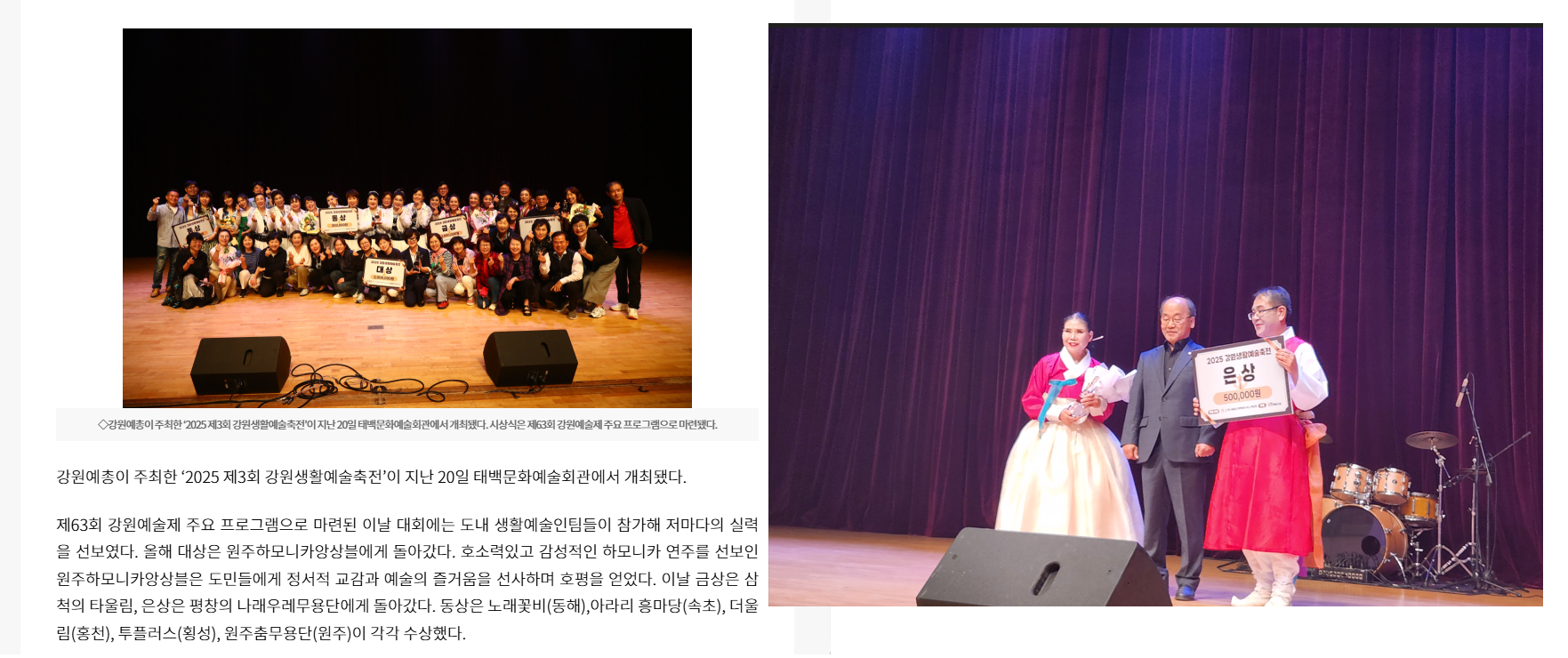 2025년 강원예술제(강원생활축전 경연대회)에서 평창의 대표로 출전하여 영예의 은상을 수상하였습니다.