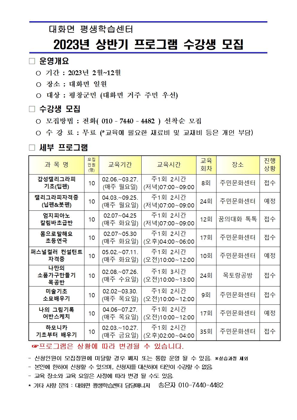 2023년 방림면 평생학습센터 상반기 프로그램 수강생 모집