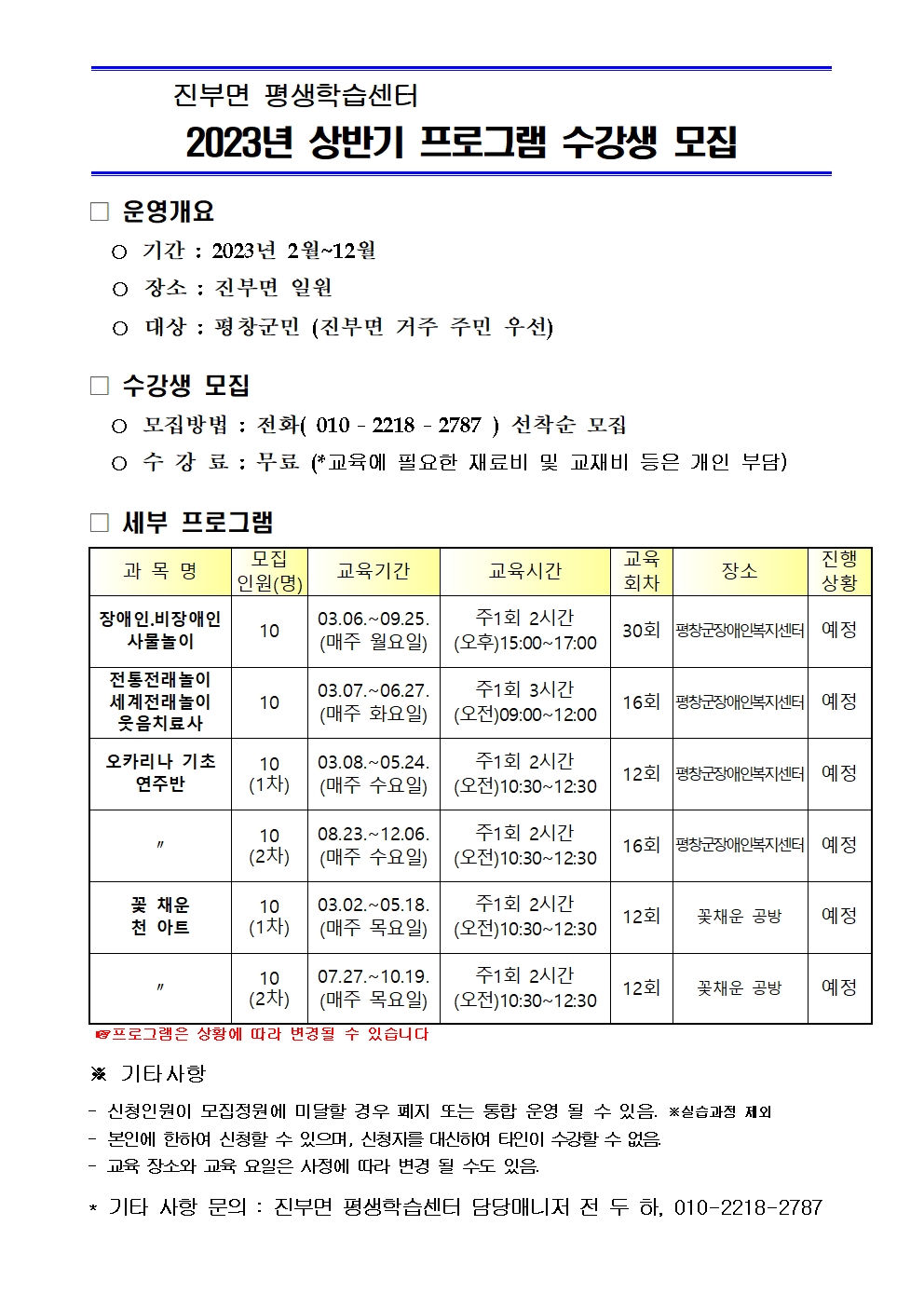 2023년 진부면 평생학습센터 상반기 프로그램 수강생 모집