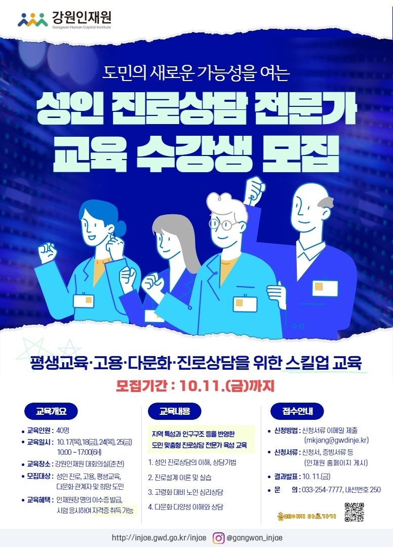 강원인재원에서 도민들의 새로운 가능성과 안정적인 진로 전환을 지원하는 전문가를 육성하고 역량을 향상시키기 위한 「성인 진로상담 전문가 교육」을 아래와 같이 운영하오니,