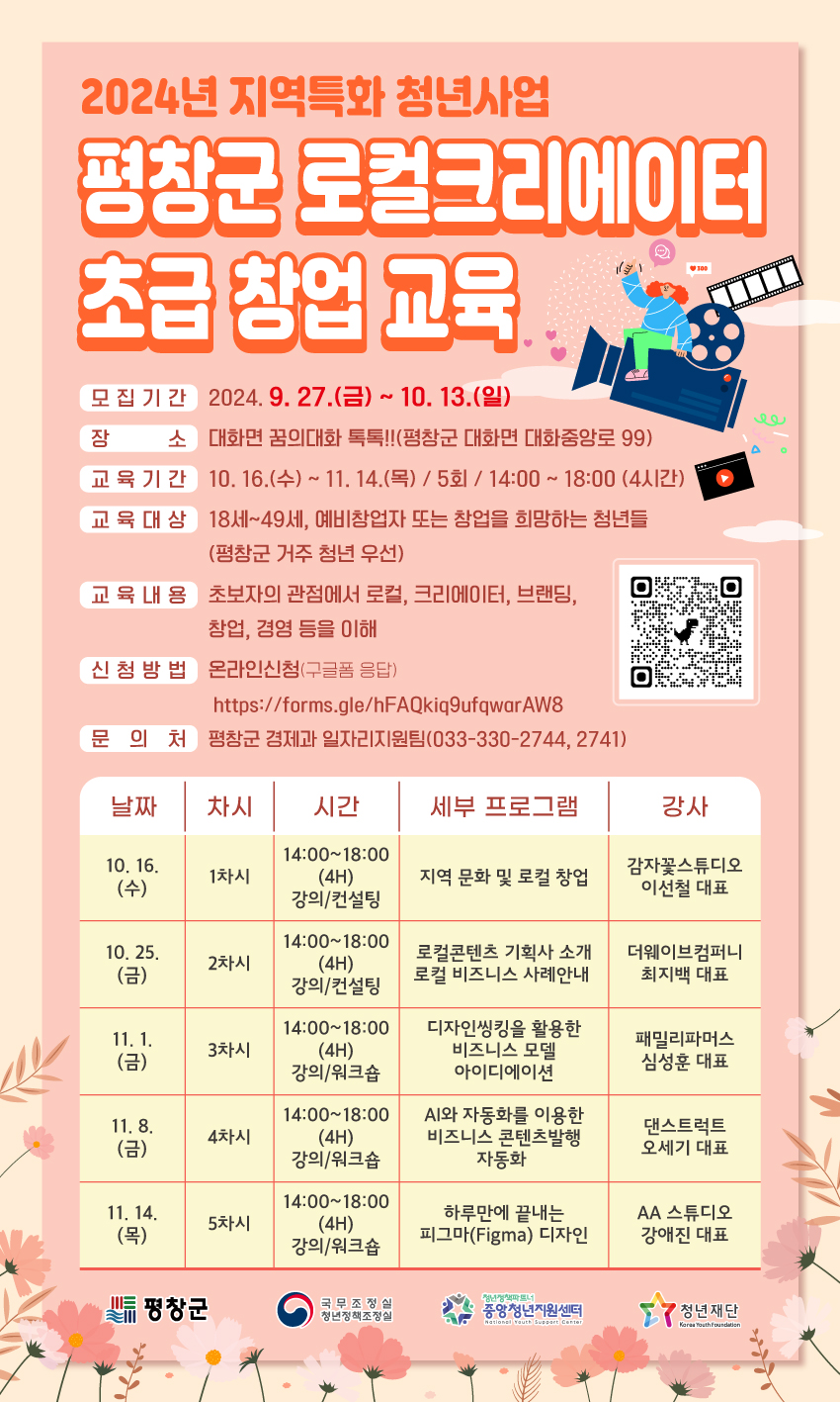 평창군에서는 '2024년 지역특화 청년사업'의 일환으로 평창군 로컬크리에이터 초급 창업 교육을 운영합니다.