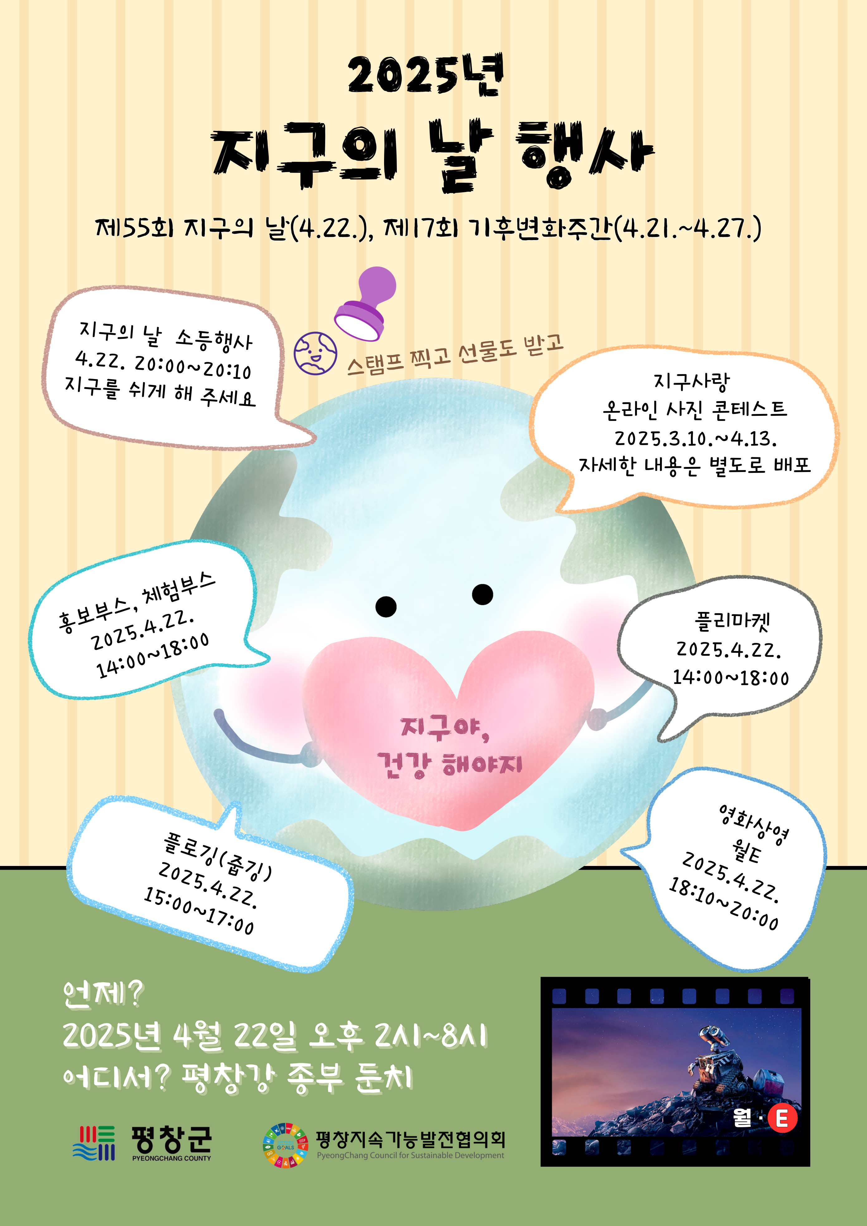 4월 22일 ‘지구의 날’을 맞아, 평창군민이 함께할 수 있는 환경행사를 아래와 같이 진행합니다.
