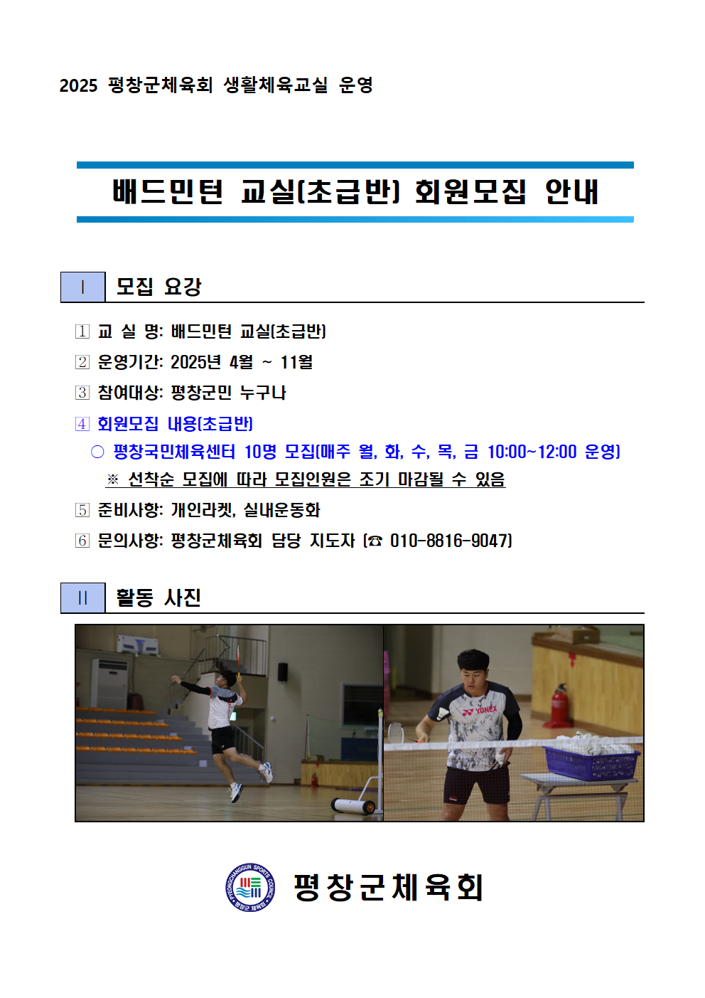 평창군체육회 배드민턴 교실(초급반) 회원모집 안내