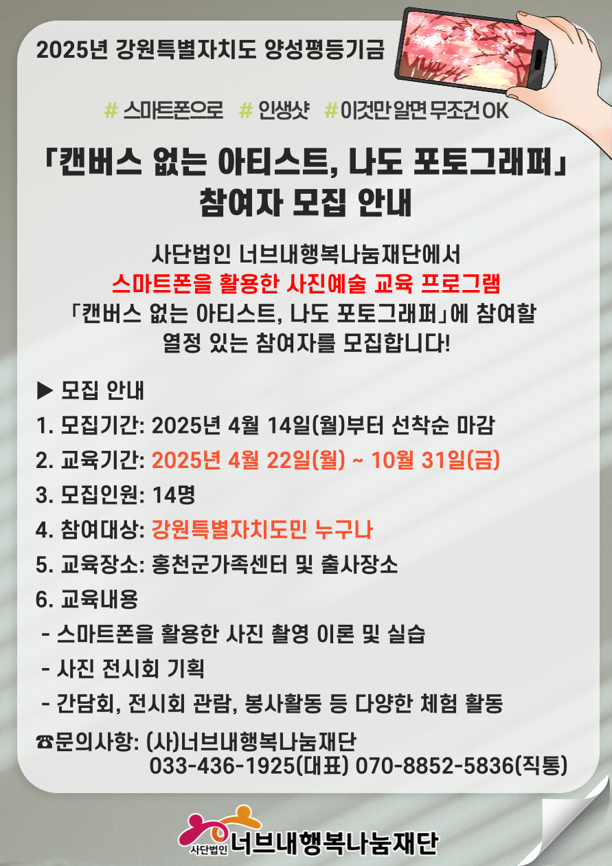 2025년 (사)너브내행복나눔재단 '캔버스 없는 아티스트, 나도 포토그래퍼' 참여 대상자 모집