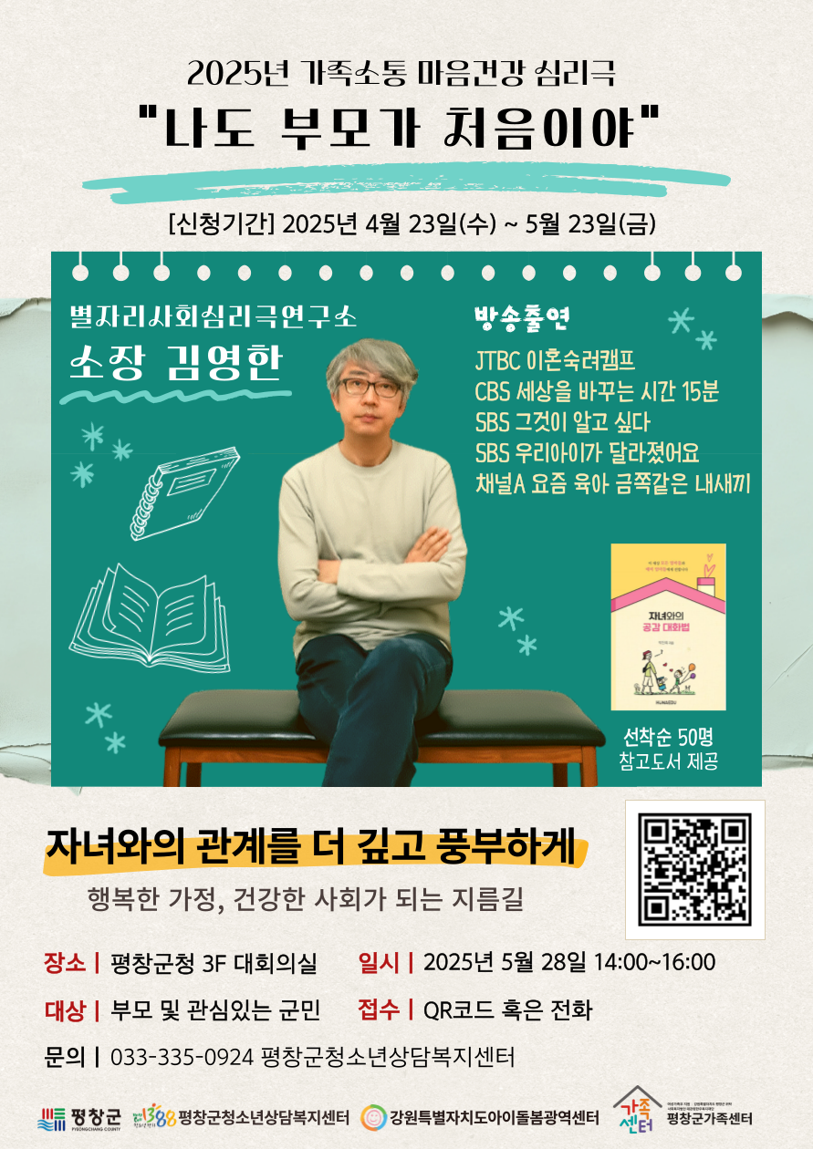 평창군청소년상담복지센터는 5월 28일(수) 14시 평창군청 3층 대회의실에서 지역 내 아동 및 청소년 부모를 대상으로 부모교육 특강을 실시합니다.