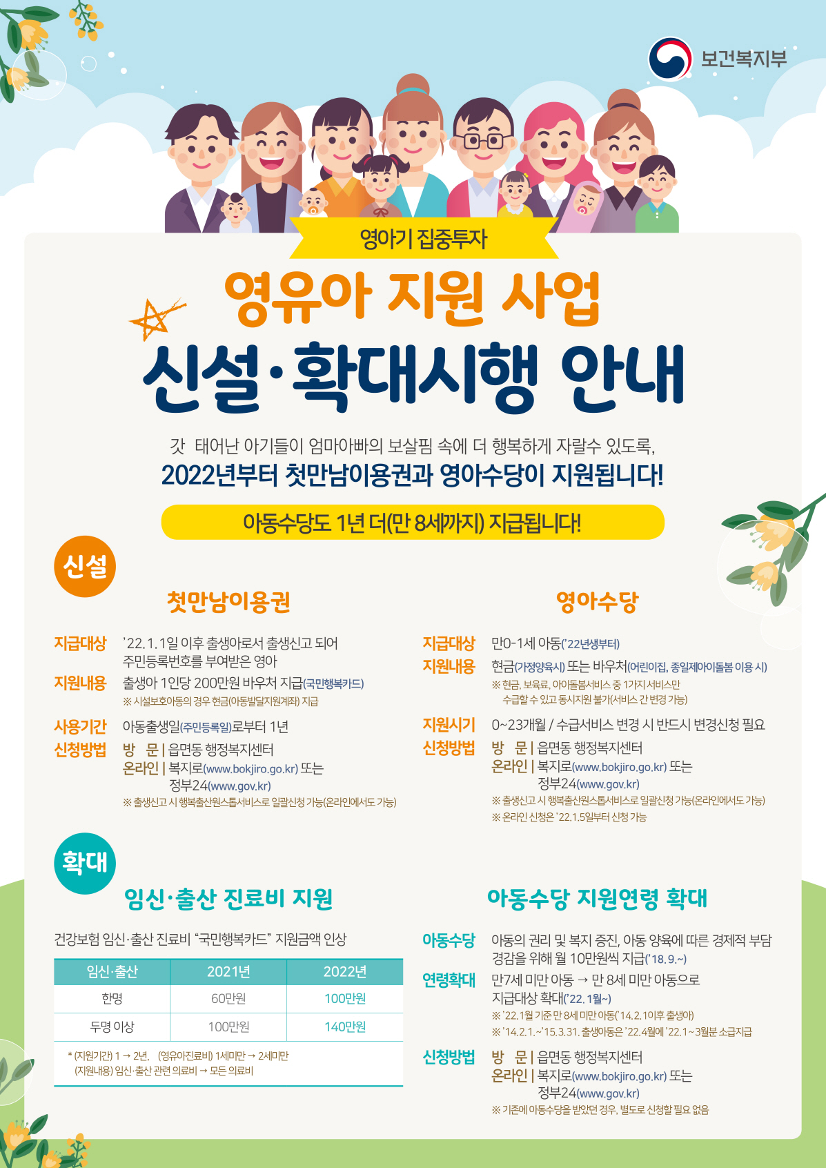 「아동수당법」개정(만7세 미만 →만8세 미만 아동으로 연령 확대, '22년 4월 1일 시행)에 따라 아동수당 연령확대 안내드리니 첨부물을 확인하시기 바랍니다.