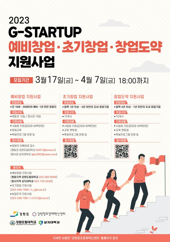 강원창조경제혁신센터에서는 강원도와 함께 혁신적인 기술 창업 소재가 있는 창업기업을 육성하기 위한 「G-STARTUP 예비창업/초기창업/창업도약 지원사업」을 운영합니다. 기술창업에 관심있는 많은 창업기업분들이 참여하실 수 있도록 아래 내용과 같이 홍보 협조 부탁드립니다.