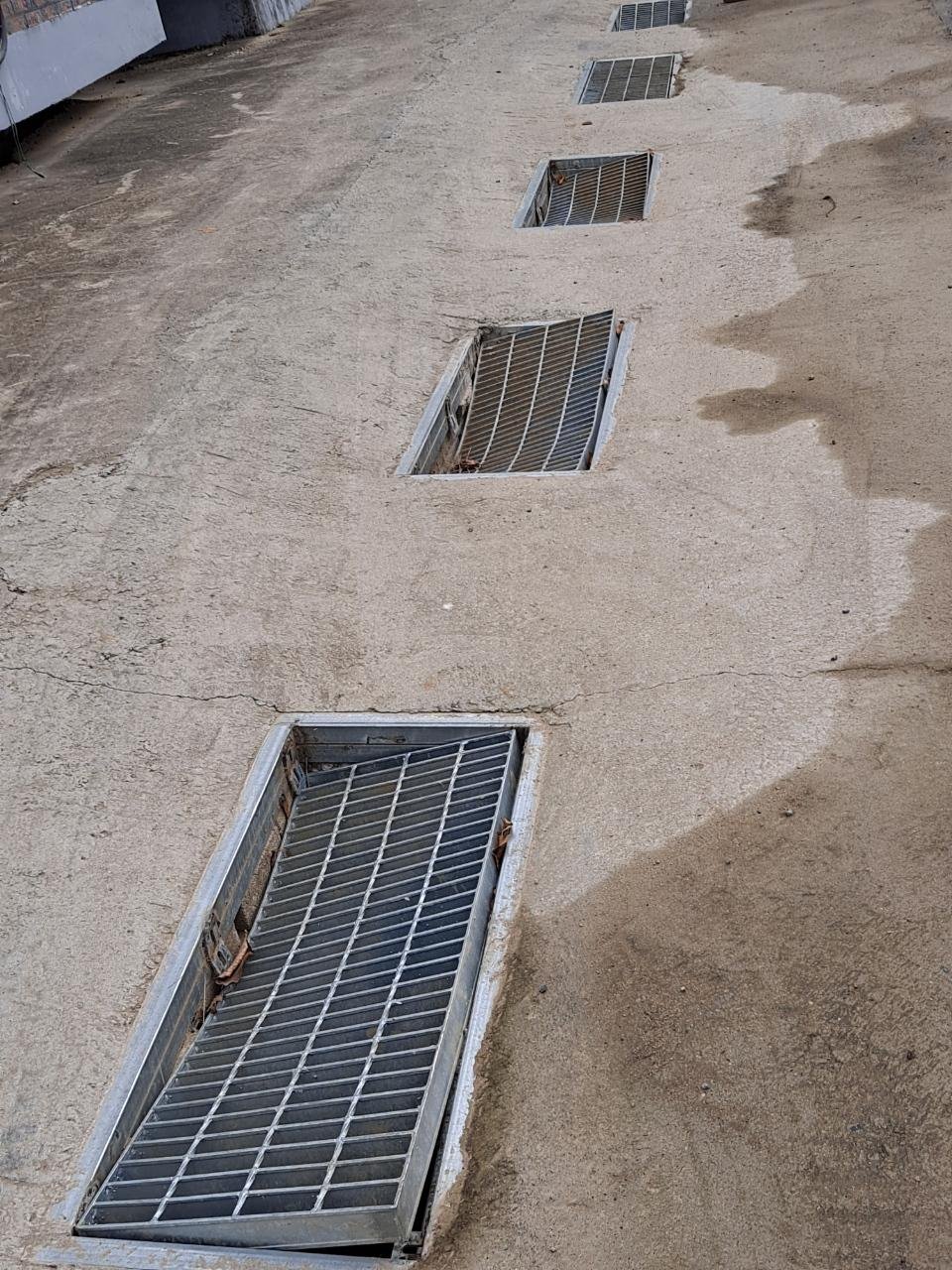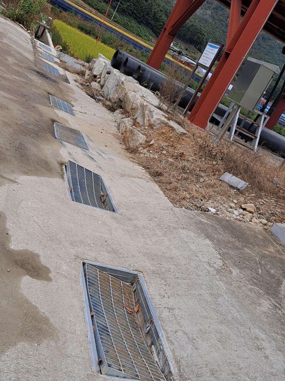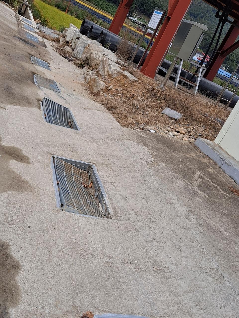 그러던중 골재를 싫어 나르는 덤프트럭이 서로 길을 비켜주는 과정에서 마을회관(다수리) 농수로 위에 설치된 그레이팅이 훼손되는 일이 생겼습니다. 옆의 다른 그레이팅은 괜찬은데...이것은 많이 훼손되었습니다.