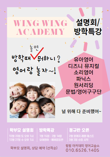 프리미엄 영어교습소 윙윙 아카데미가 겨울방학 특강을 시작으로 오픈합니다.