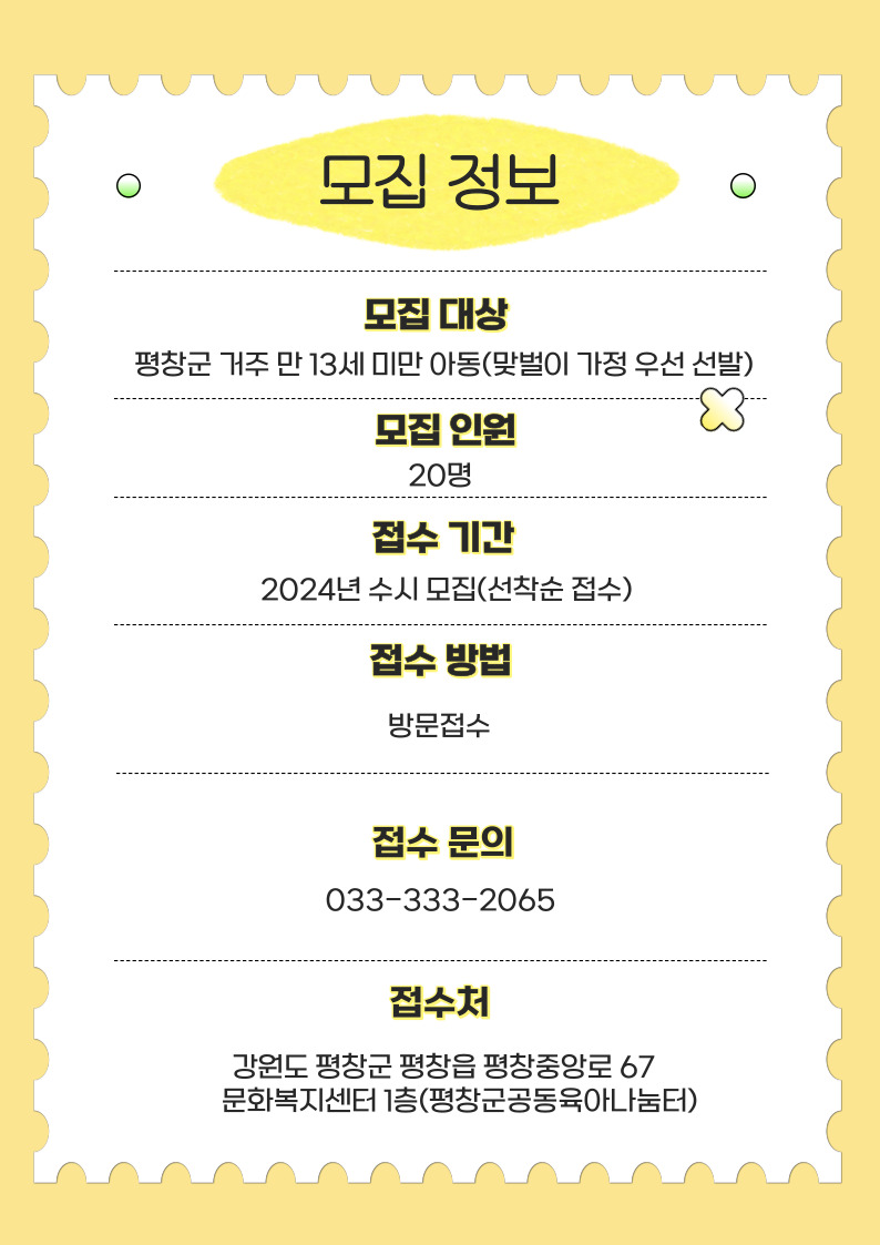 2024년 평창군가족센터 공동육아나눔터 모집안내(미취학, 초등학생) 입니다~!