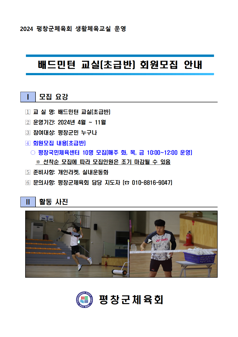 평창군체육회 배드민턴 교실(초급반) 회원모집 안내