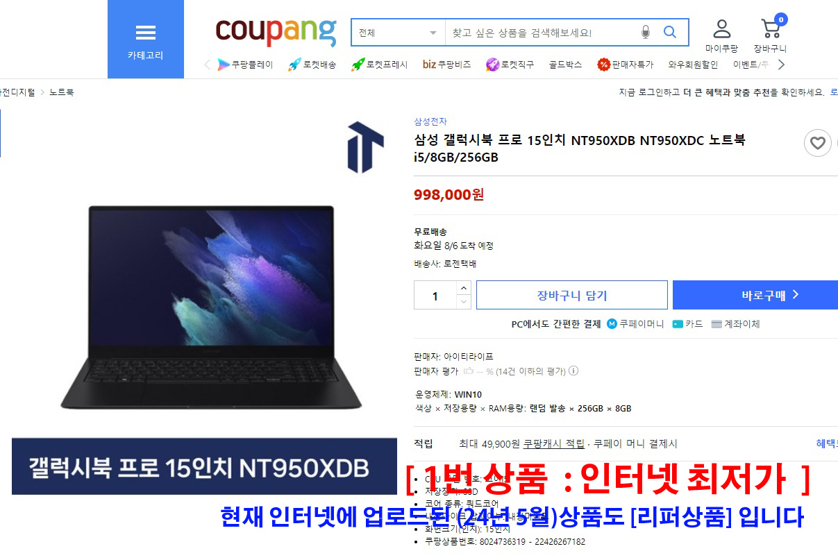 [1] 삼성 노트북 Galaxy2 NT950XDB-KM59S 15.6〃12Ge 리퍼제품 ▣ 1대 ₩750,000