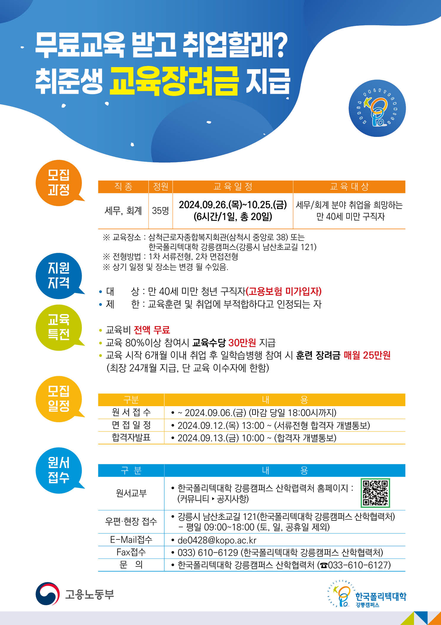 강릉 폴리텍 산학협력처에서 세무, 회계 분야 취업 연계형 국비 무료 교육생을 모집합니다.