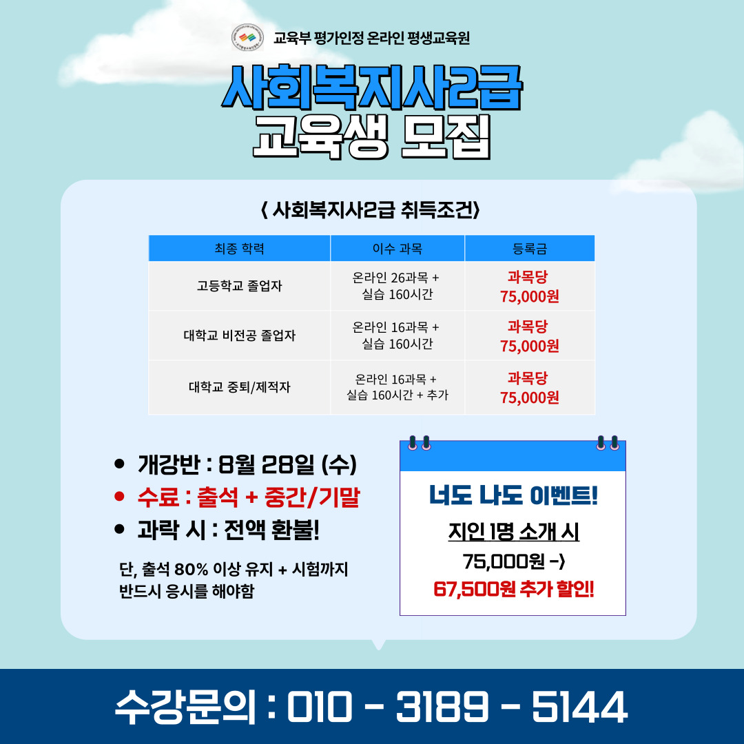 ㉠ 온라인 과목 : 75,000원 (기존 50%할인 + 지인 동반 시 5% 추가 할인)