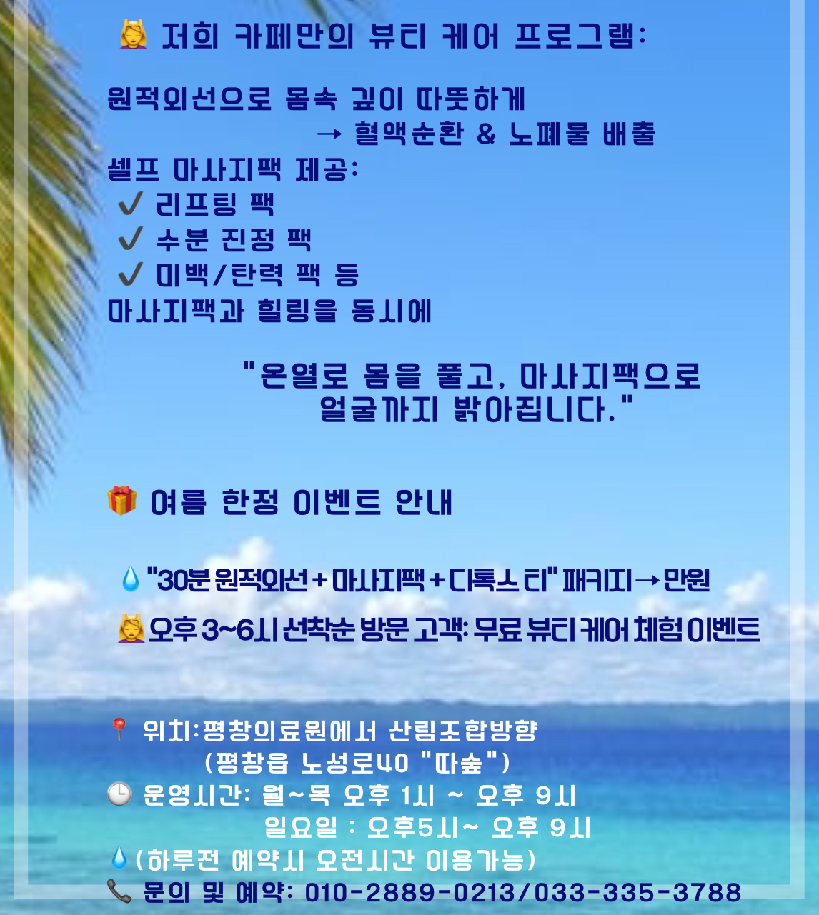오후3시~6시까지 방문하시는분들은 무료 뷰티케어 체험을 즐길수 있답니다