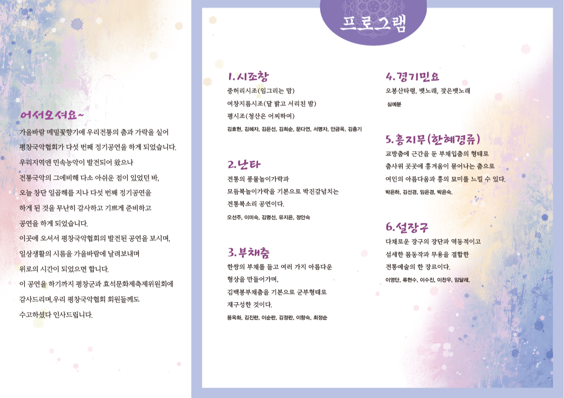 평창군민의 많은격려와 응원부탁드리며 한국의 전통국악의 향연을 즐기시기 바람니다.