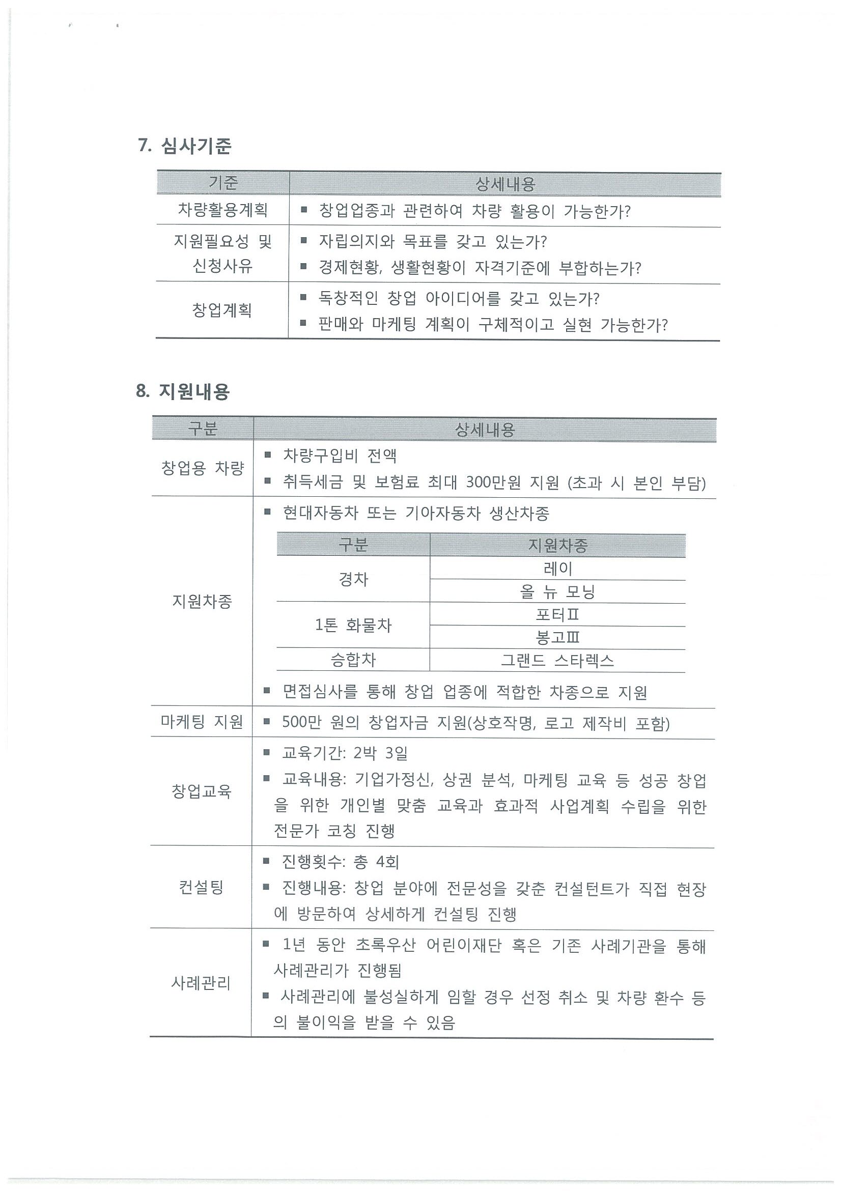 ○ 지원내용 : 차업용 차량, 차량 취득세금 및 보험료, 창업자금, 컨설팅 등