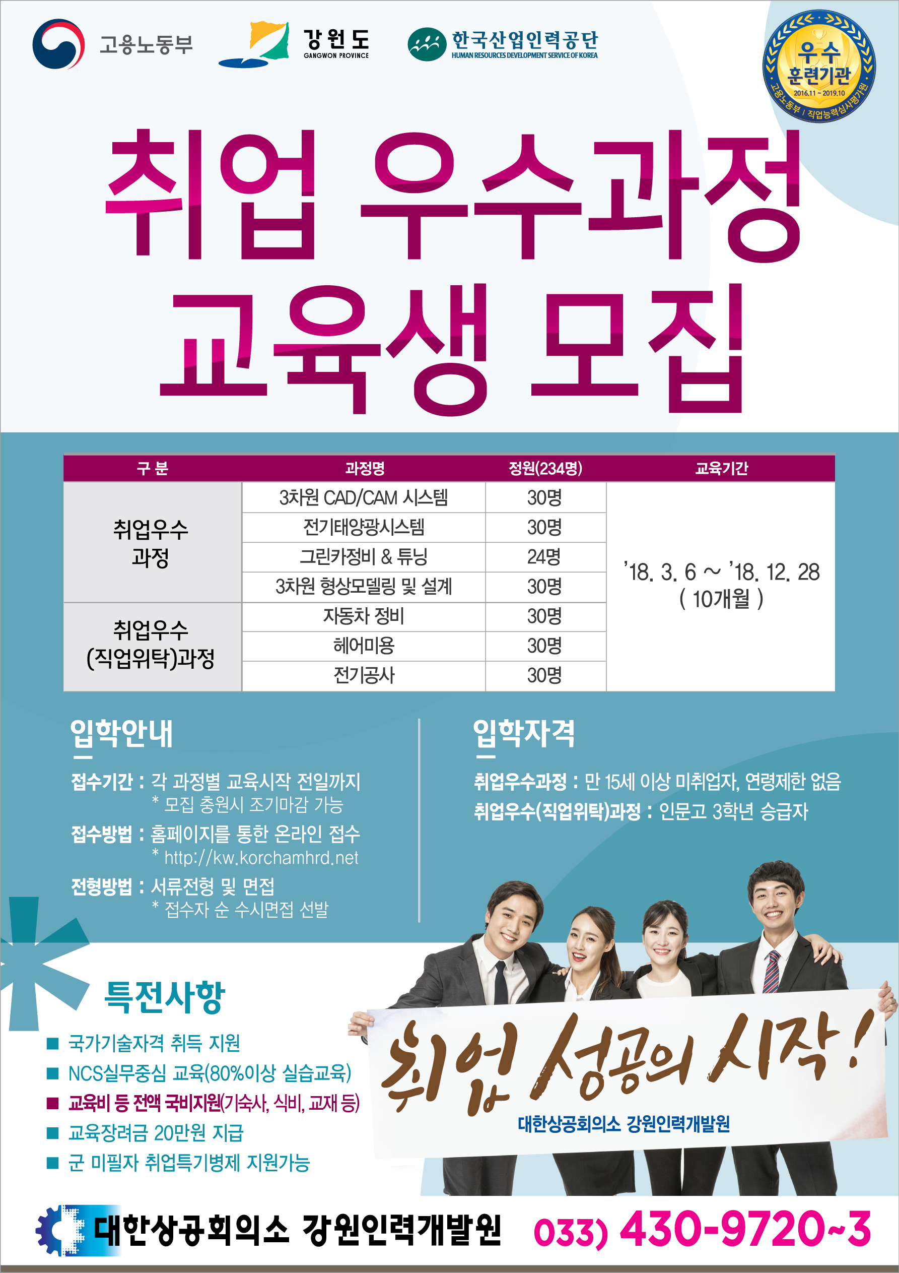 강원도인적자원개발위원회에서는 「지역 산업 맞춤형 인력양성사업 훈련」을 수행하고자 공동훈련센터를 선정, 강원지역의 인력양성 계획을 수립 운영하고 있습니다.