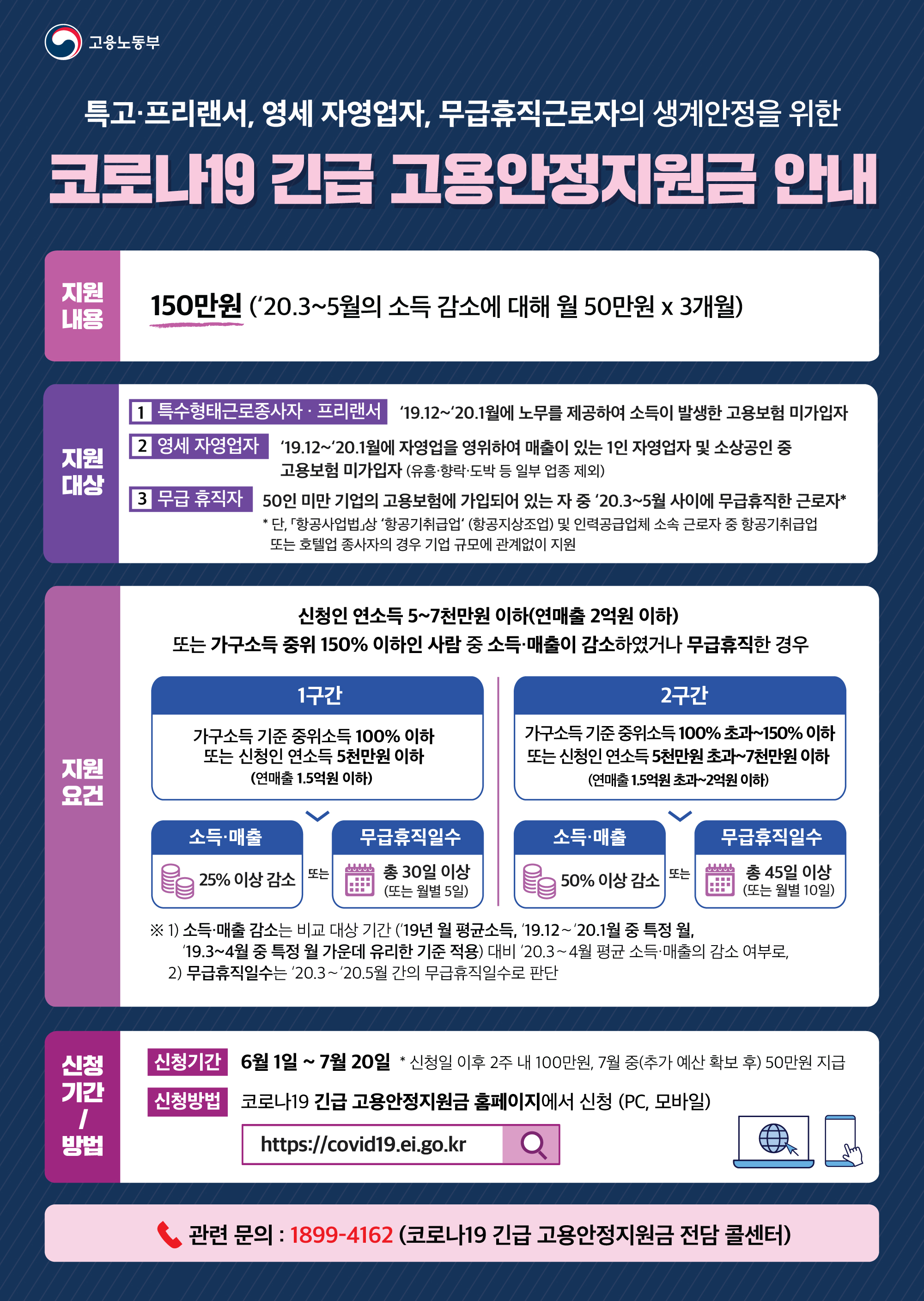 ○ 문 의 처 : 코로나19 긴급 고용안정지원금 전담 콜센터(☎1899-4162)