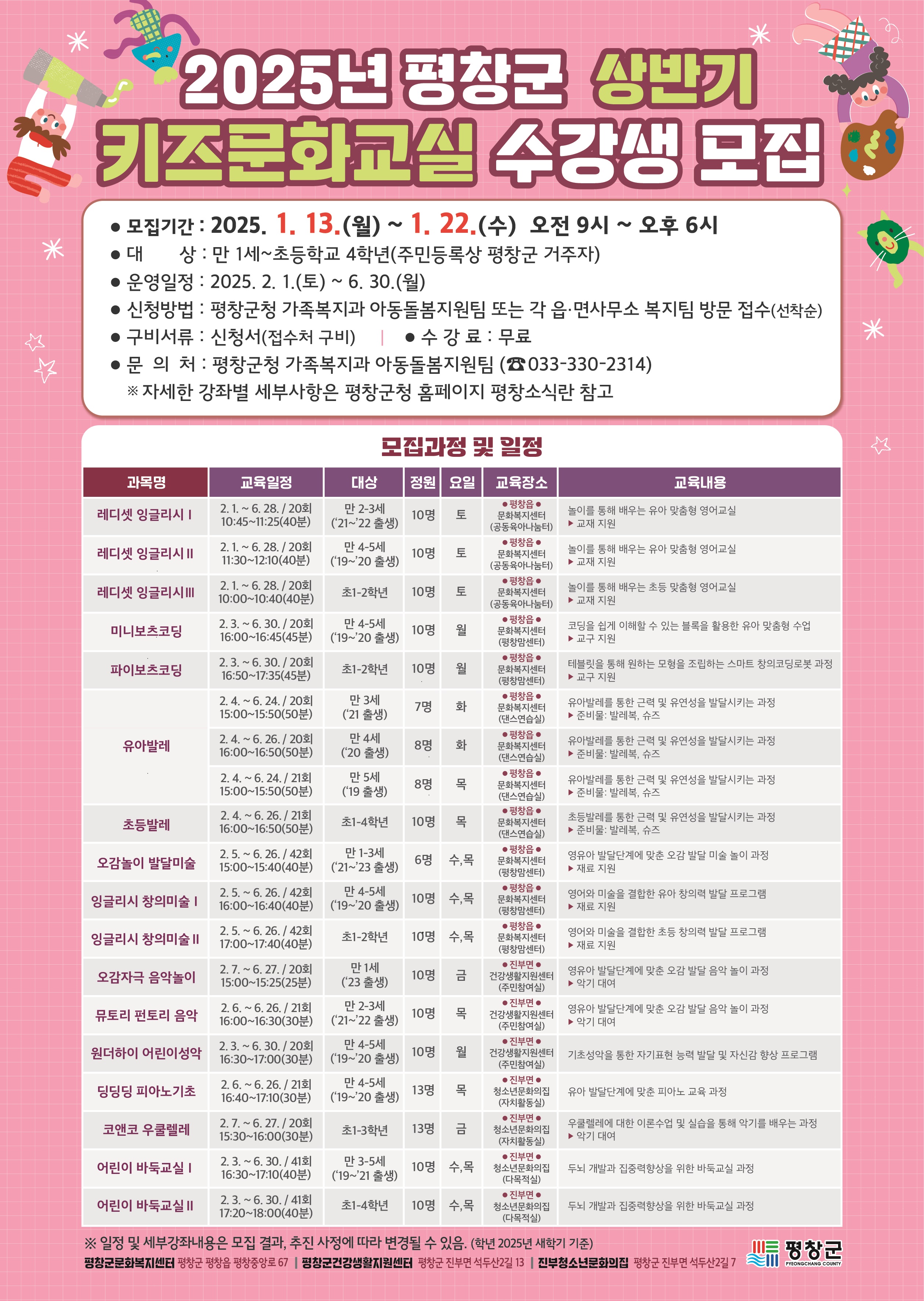 2025년 평창군 상반기 키즈문화교실 접수가 2025. 1. 13.(월)부터 시작됩니다.