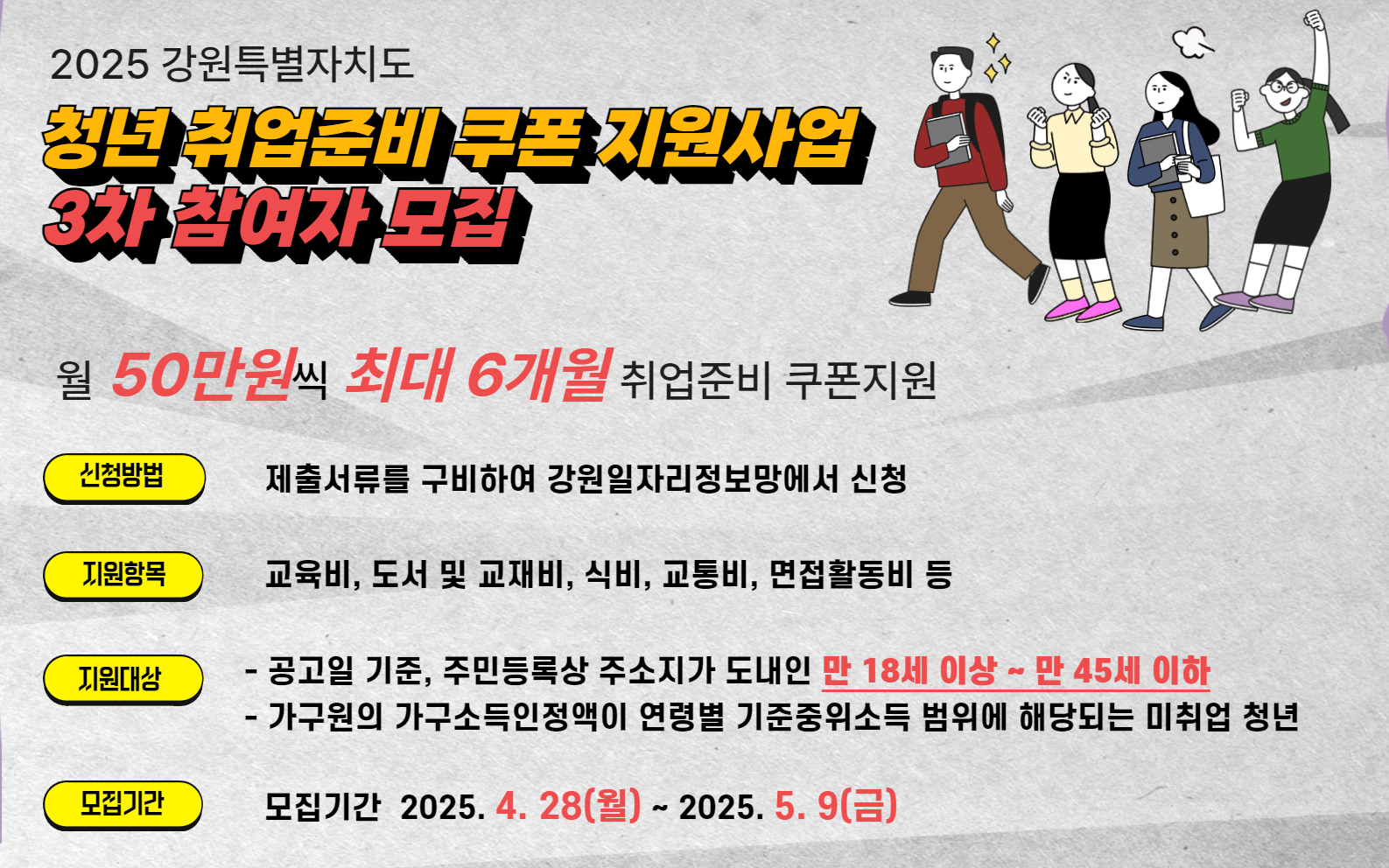 강원특별자치도에서는 도내 미취업 청년의 구직역량 강화를 위하여, 구직활동에 필요한 비용을 1인 최대 300만 원까지 지원하는「청년 취업준비 쿠폰 지원사업」(청년 구직활동 지원사업)을 추진하고 있습니다. 이와 관련하여 「청년 취업준비 쿠폰 지원사업」참여자 3차모집 공고문, 홍보 배너 를 붙임과 같이 알려드리니, 관심 있는 분들은 신청하여 주시기 바랍니다.