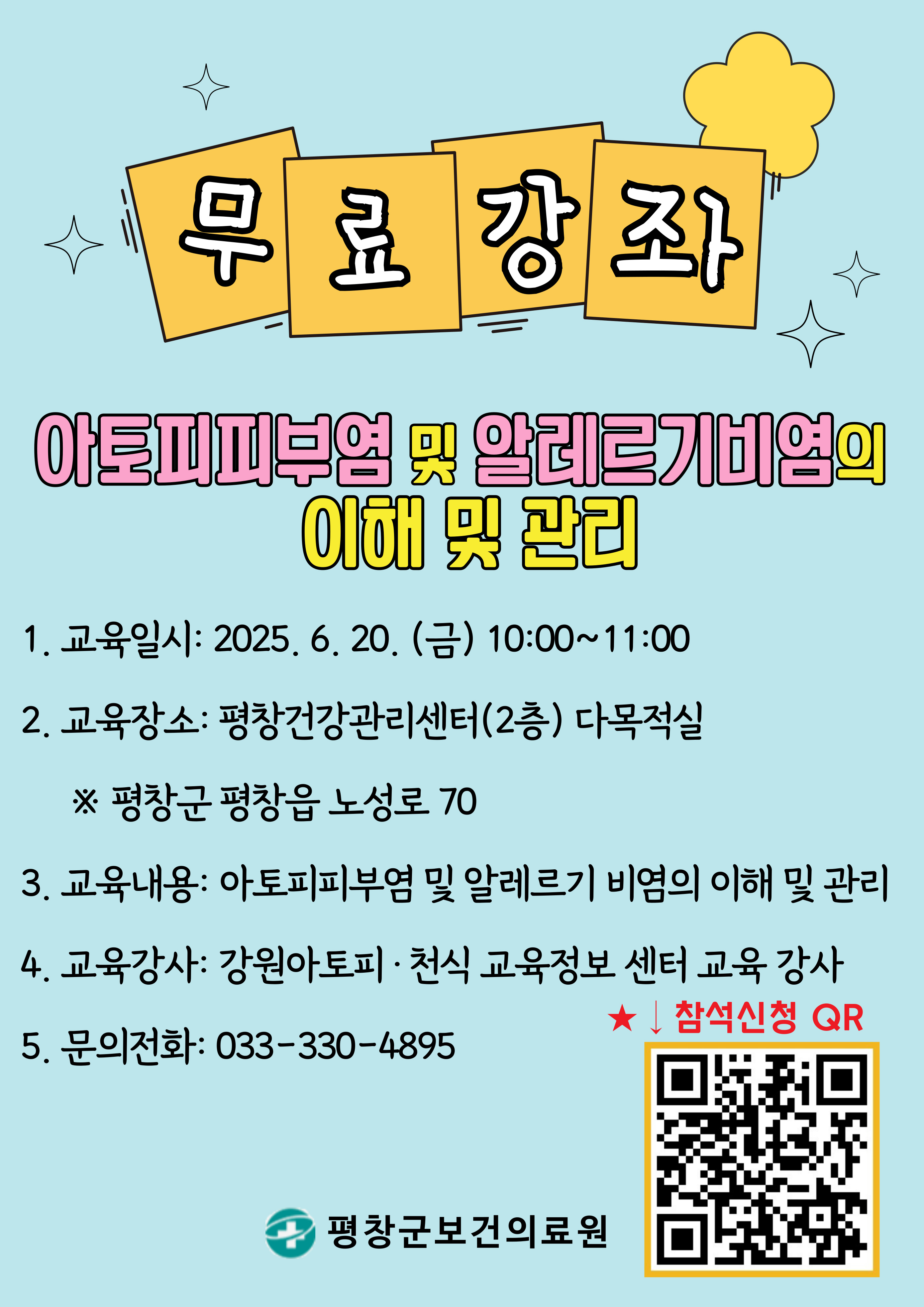 평창군보건의료원 평창건강관리센터에서 아토피피부염 및 알레르기비염의 이해 및 관리에 대한 무료 강좌를 운영합니다. 많은 관심과 참여 부탁드립니다.