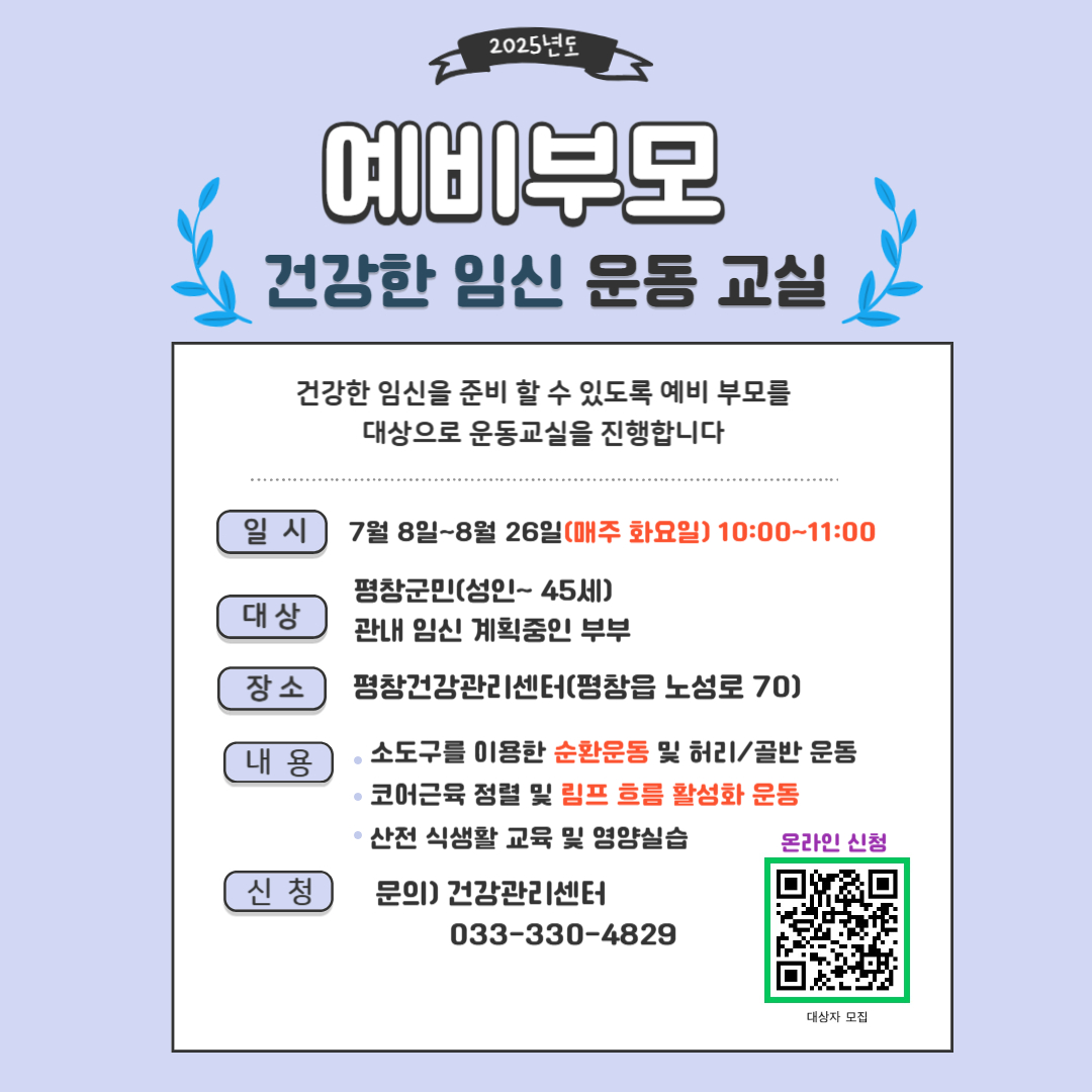 평창건강관리센터에서 「예비부모를 위한 건강한 임신」 운동 프로그램을 운영합니다. 많은 관심과 참여 부탁드립니다.