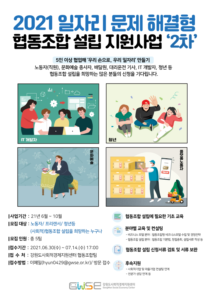 강원도사회적경제지원센터에서는 도내 직원·프리랜서·청년 등 (사회적)협동조합 설립 희망자를 대상으로 「2021 일자리 문제 해결형 협동조합 설립 지원사업」참여자를 모집합니다.