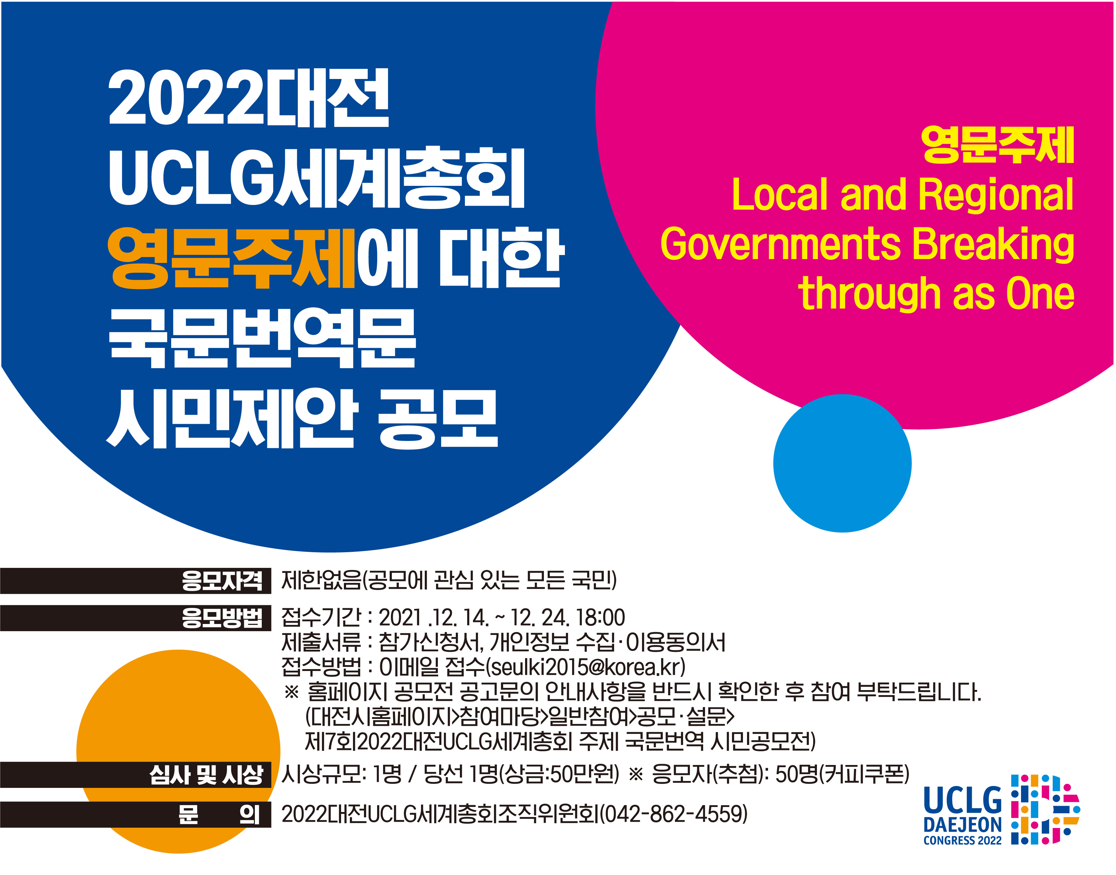 대전광역시에서는 시민에게 2022대전UCLG세계총회를 널리 알리고 시민이 함께 참여하는 행사로 개최하기 위하여 2022대전UCLG세계총회 영문주제에 대한 국문번역문 공모를 다음과 같이 실시하오니 관심있는 시민분들의 많은 참여 바랍니다.