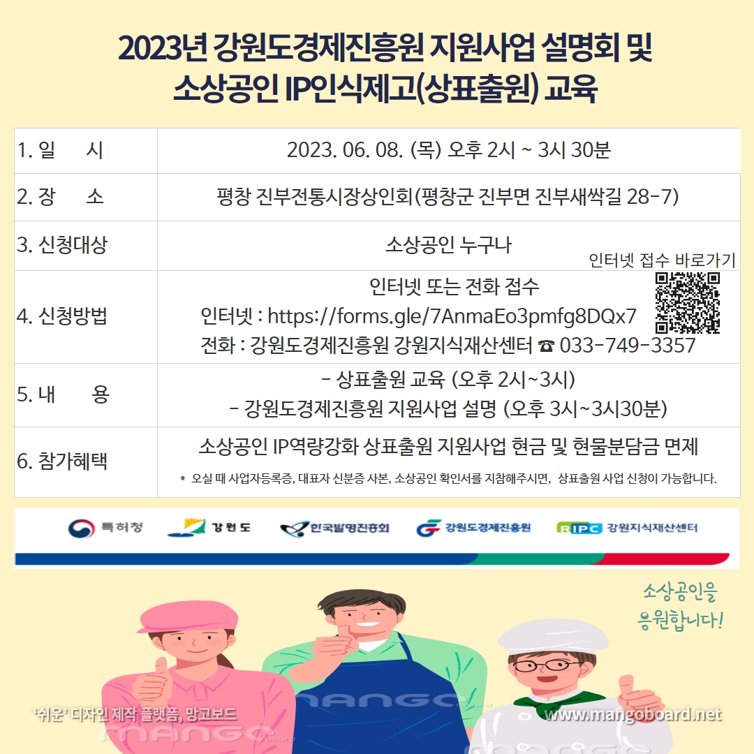 이와 관련하여, 아래와 같이 「2023년 강원도경제진흥원 지원사업 설명회 및 소상공인 IP인식제고(상표출원)교육」을 개최하오니, 관심있으신 분들께서는 신청 후 참여하여 주시기 바랍니다.