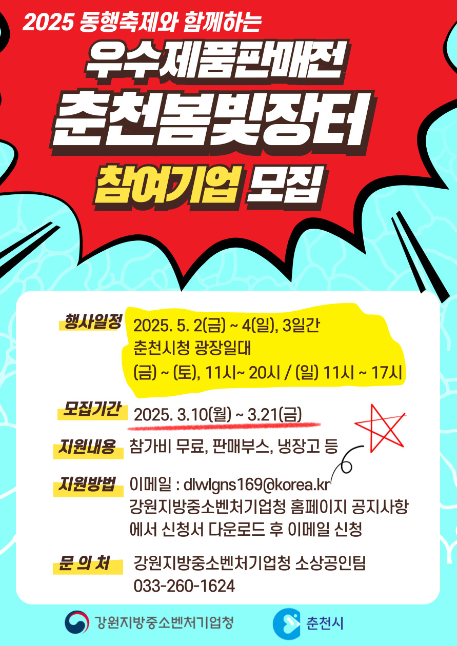 2. 이와 관련, 동행축제와 가정의 달을 맞아 도내 우수 중소기업 제품의 특별할인 판매와 다양한 부대행사를 진행하는 '우수 중소기업 제품 판촉전, 춘천봄빛장터'를 개최하여 참여기업을 아래와 같이 모집함을 알려드립니다.